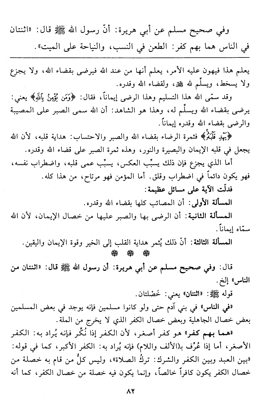 قال: وفي صحيح مسلم عن أبي هريرة: أن رسول الله صَلَّى اللَّهُ عَلَيْهِ وَسَلَّمَ قال: "اثنتان من النّاس" إلخ.