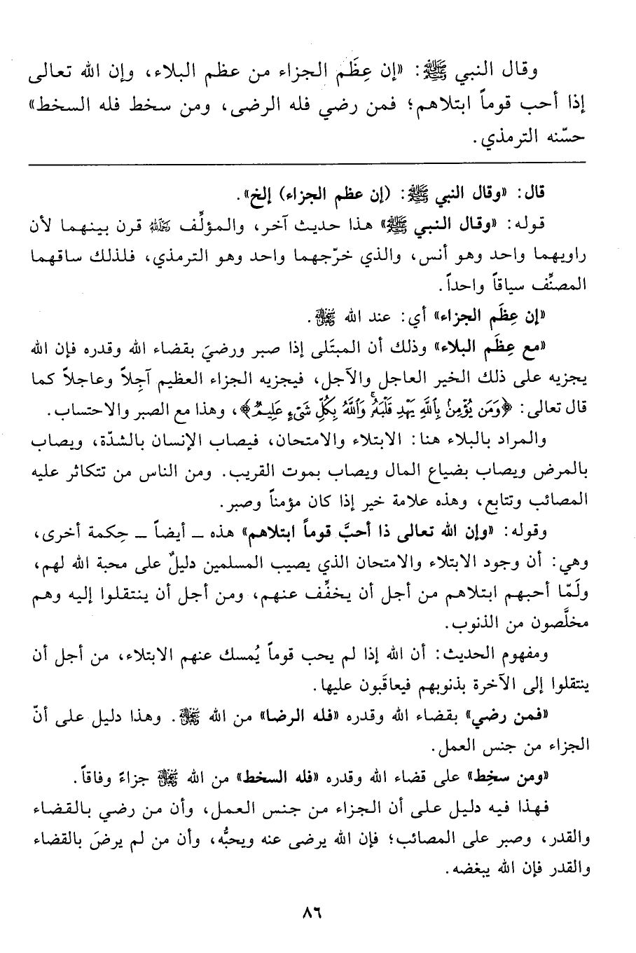 قال: "وقال النبي صَلَّى اللَّهُ عَلَيْهِ وَسَلَّمَ: "إن عظم الجزاء" إلخ.