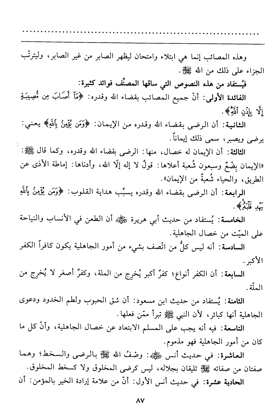 الثالثة: أن الإيمان له خصال، منها: الرضى بقضاء الله وقدره، وكما قال صَلَّى اللَّهُ عَلَيْهِ وَسَلَّمَ: "الإيمان بِضْعٌ وسبعون شُعبة أعلاها: قولٌ لا إله إلاَّ الله، وأدناها: إماطة الأذى عن الطريق، والحياء شُعبةٌ من الإيمان".