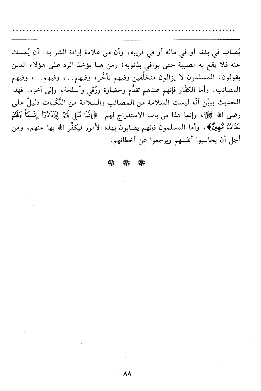 يُصاب في بدنه أو في ماله أو في قريبه، وأن من علامة إرادة الشر به: أن يُمسك عنه فلا يقع به مصيبة حتى يوافي بذنوبه؛ ومن هنا يؤخذ الرد على هؤلاء الذين يقولون: المسلمون لا يزالون متخلِّفين وفيهم تأخُّر، وفيهم..، وفيهم..، وفيهم المصائب. وأما الكفّار فإنهم عندهم تقدُّم وحضارة ورُقي وأسلحة، وإلى آخره. فهذا الحديث يبيِّن أنّه ليست السلامة من المصائب والسلامة من النَّكَبات دليلٌ على رضى الله سبحانه وتعالى، وإنما هذا من باب الاستدراج لهم: {إِنَّمَا نُمْلِي لَهُمْ لِيَزْدَادُوا إِثْماً وَلَهُمْ عَذَابٌ مُهِينٌ} ، وأما المسلمون فإنهم يصابون بهذه الأمور ليكفِّر الله بها عنهم، ومن أجل أن يحاسبوا أنفسهم ويرجعوا عن أخطائهم.