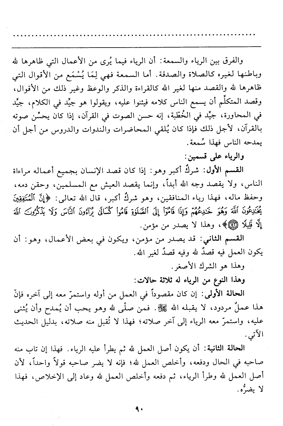 القسم الأول: شركٌ أكبر وهو: إذا كان قصد الإنسان بجميع أعماله مراءاة النّاس، ولا يقصد وجه الله أبداً، وإنما يقصد العيش مع المسلمين، وحقن دمه، وحفظ ماله، فهذا رياء المنافقين، وهو شركٌ أكبر، قال الله تعالى: {إِنَّ الْمُنَافِقِينَ يُخَادِعُونَ اللهَ وَهُوَ خَادِعُهُمْ وَإِذَا قَامُوا إِلَى الصَّلاةِ قَامُوا كُسَالَى يُرَاؤُونَ النَّاسَ وَلا يَذْكُرُونَ اللهَ إِلَّا قَلِيلاً (142) } ، وهذا لا يصدر من مؤمن.