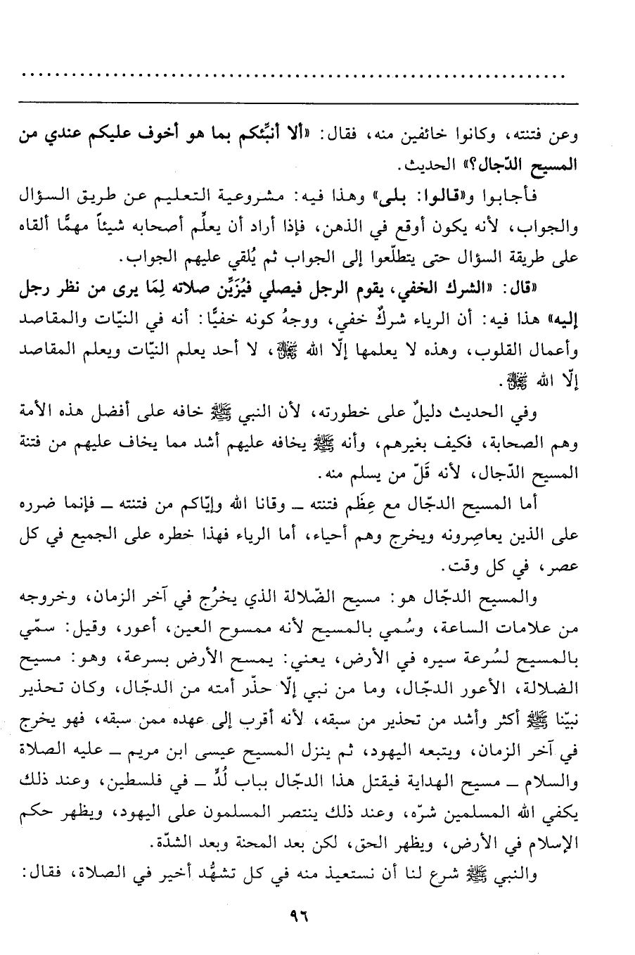 أما المسيح الدجال مع عِظَم فتنته -وقانا الله وإيّاكم من فتنته- فإنما ضرره على الذين يعاصِرونه ويخرج وهم أحياء، أما الرياء فهذا خطره على الجميع في كل عصر، في كل وقت.