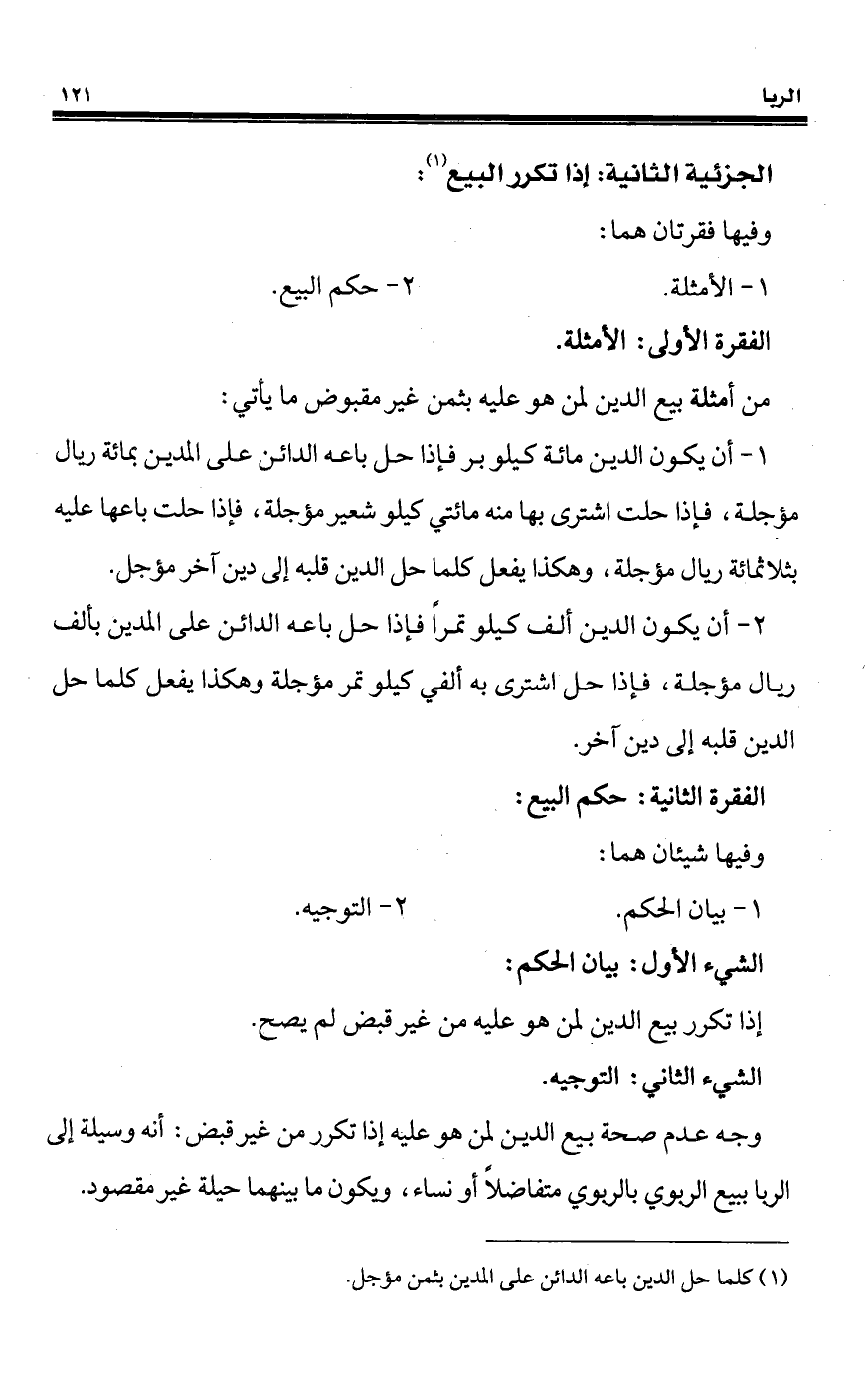 2 - أن يكون الدين ألف كيلو تمرًا فإذا حل باعه الدائن على المدين بألف ريال مؤجلة، فإذا حل اشترى به ألفي كيلو تمر مؤجلة وهكذا يفعل كلما حل الدين قلبه إلى دين آخر.