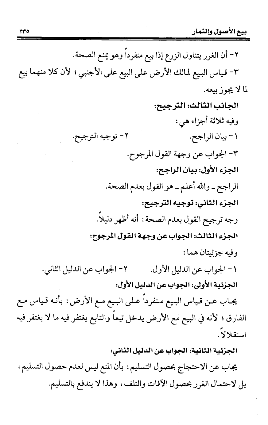 يجاب عن قياس البيع منفرداً على البيع مع الأرض: بأنه قياس مع الفارق؛ لأنه في البيع مع الأرض يدخل تبعاً والتابع يغتفر فيه ما لا يغتفر فيه استقلالاً.