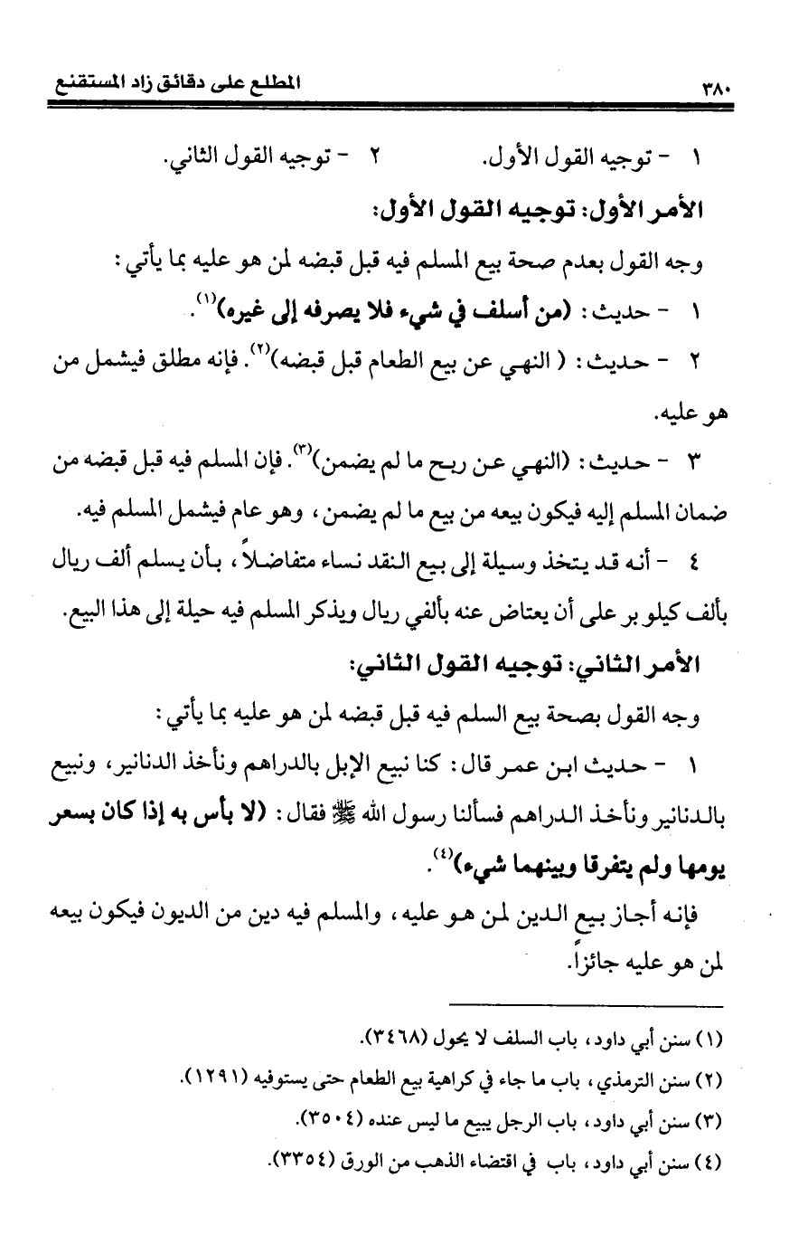 3 - حديث: (النهي عن ربح ما لم يضمن) (¬3). فإن المسلم فيه قبل قبضه من ضمان المسلم إليه فيكون بيعه من بيع ما لم يضمن، وهو عام فيشمل المسلم فيه.