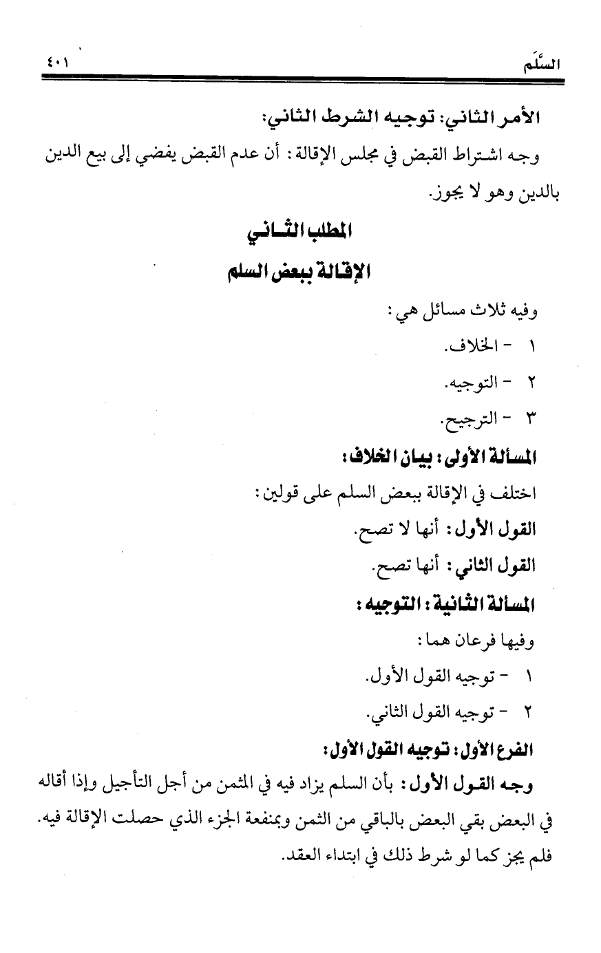 وجه القول الأول: بأن السلم يزاد فيه في المثمن من أجل التأجيل وإذا أقاله في البعض بقي البعض بالباقي من الثمن وبمنفعة الجزء الذي حصلت الإقالة فيه. فلم يجز كما لو شرط ذلك في ابتداء العقد.