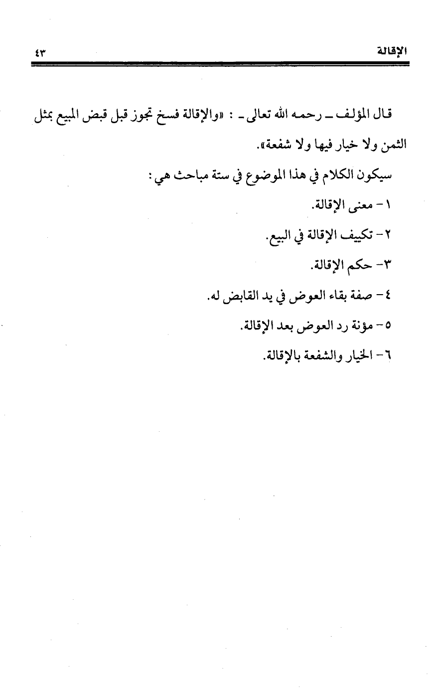قال المؤلف - رَحِمَهُ اللهُ تعالى -: "والإقالة فسخ تجوز قبل قبض المبيع بمثل الثمن ولا خيار فيها ولا شفعة".
