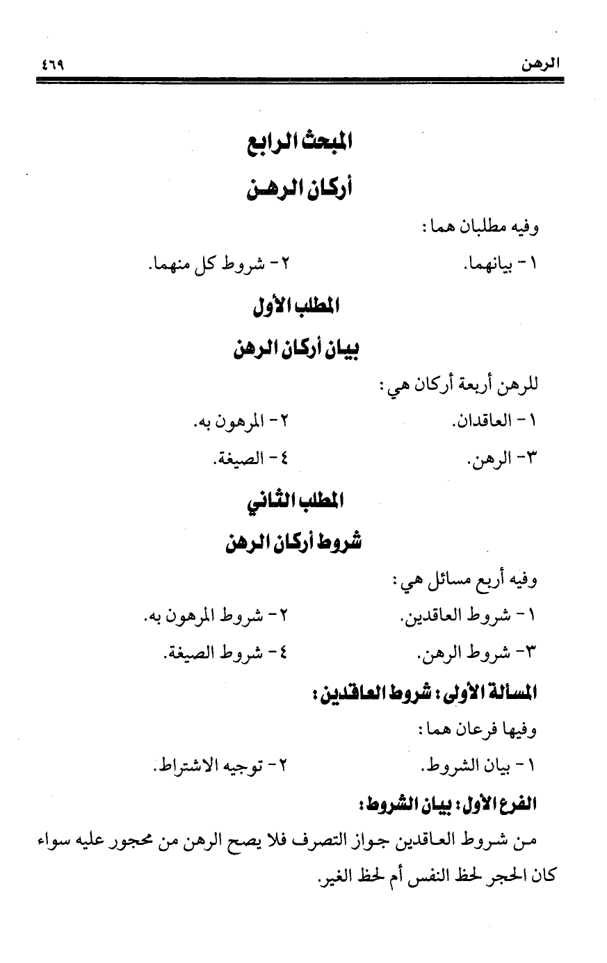 من شروط العاقدين جواز التصرف فلا يصح الرهن من محجور عليه سواء كان الحجر لحظ النفس أم لحظ الغير.