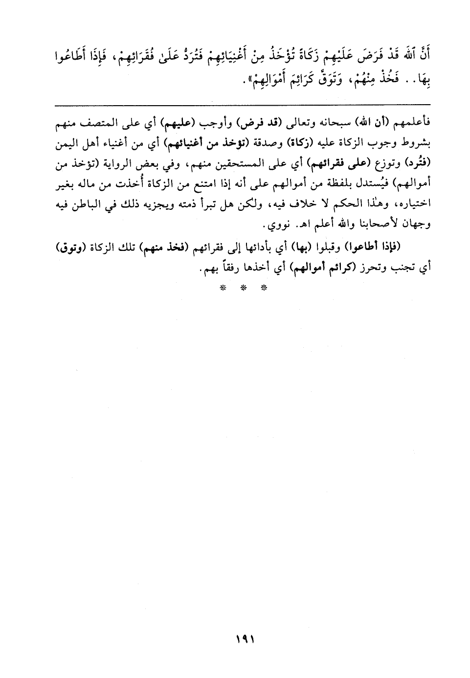 أَنَّ الله قَدْ فَرَضَ عَلَيهِمْ زَكَاةً تُؤْخَذُ مِنْ أَغْنِيَائِهِمْ فَتُرَدُّ عَلَى فُقَرَائِهِمْ، فَإِذَا أَطَاعُوا بِهَا. . فَخُذْ مِنْهُمْ، وَتَوَقَّ كَرَائِمَ أَمْوَالِهِمْ"