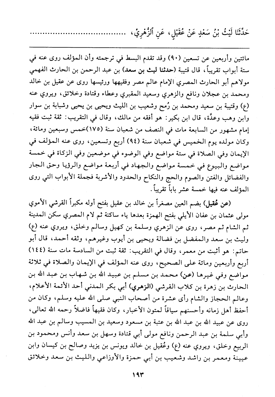 حَدَّثَنَا لَيثُ بْنُ سَعْدٍ عَنْ عُقَيلٍ، عَنِ الزُّهْرِيِّ،