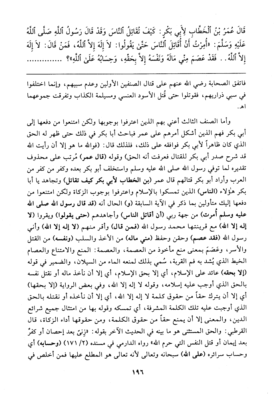 قَال عُمَرُ بْنُ الْخَطَّابِ لِأبِي بَكْرٍ: كَيفَ تُقَاتِلُ الناسَ وَقَدْ قَال رَسُولُ اللهِ صَلَّى اللهُ عَلَيهِ وَسلَّمَ: "أُمِرْتُ أَنْ أُقَاتِلَ النَّاسَ حَتى يَقُولُوا: لَا إِلَهَ إِلَّا اللهُ، فَمَنْ قَال: لَا إِلَهَ إِلَّا اللهُ .. فَقَدْ عَصَمَ مِنِّي مَالهُ وَنَفْسَهُ إِلا بِحَقِّهِ، وَحِسَابُهُ عَلَى اللهِ"؟