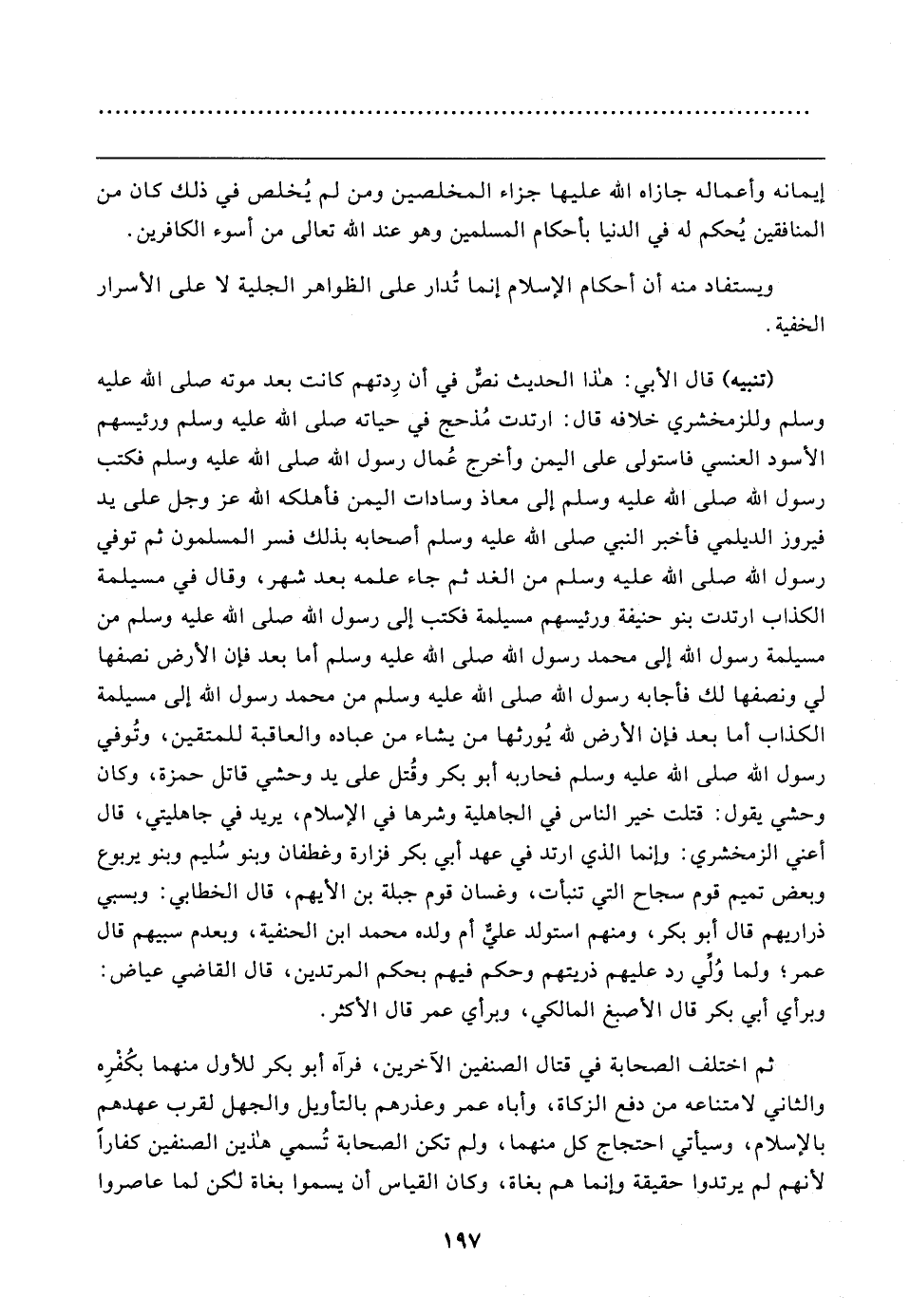 (تنبيه) قال الأبي: هذا الحديث نصٌّ في أن رِدتهم كانت بعد موته صلى الله عليه وسلم وللزمخشري خلافه قال: ارتدت مُذحج في حياته صلى الله عليه وسلم ورئيسهم الأسود العنسي فاستولى على اليمن وأخرج عُمال رسول الله صلى الله عليه وسلم فكتب رسول الله صلى الله عليه وسلم إلى معاذ وسادات اليمن فأهلكه الله عزَّ وجلَّ على يد فيروز الديلمي فأخبر النبي صلى الله عليه وسلم أصحابه بذلك فسر المسلمون ثم توفي رسول الله صلى الله عليه وسلم من الغد ثم جاء علمه بعد شهر، وقال في مسيلمة الكذاب ارتدت بنو حنيفة ورئيسهم مسيلمة فكتب إلى رسول الله صلى الله عليه وسلم من مسيلمة رسول الله إلى محمد رسول الله صلى الله عليه وسلم أما بعد فإن الأرض نصفها لي ونصفها لك فأجابه رسول الله صلى الله عليه وسلم من محمد رسول الله إلى مسيلمة الكذاب أما بعد فإن الأرض لله يُورثها من يشاء من عباده والعاقبة للمتقين، وتُوفي رسول الله صلى الله عليه وسلم فحاربه أبو بكر وقُتل على يد وحشي قاتل حمزة، وكان وحشي يقول: قتلت خير الناس في الجاهلية وشرها في الإسلام، يريد في جاهليتي، قال أعني الزمخشري: وإنما الذي ارتد في عهد أبي بكر فزارة وغطفان وبنو سُليم وبنو يربوع وبعض تميم قوم سجاح التي تنبأت، وغسان قوم جبلة بن الأيهم، قال الخطابي: وبسبي ذراريهم قال أبو بكر، ومنهم استولد عليٌّ أم ولده محمد ابن الحنفية، وبعدم سبيهم قال عمر؛ ولما وُلِّي رد عليهم ذريتهم وحكم فيهم بحكم المرتدين، قال القاضي عياض: وبرأي أبي بكر قال الأصبغ المالكي، وبرأي عمر قال الأكثر.