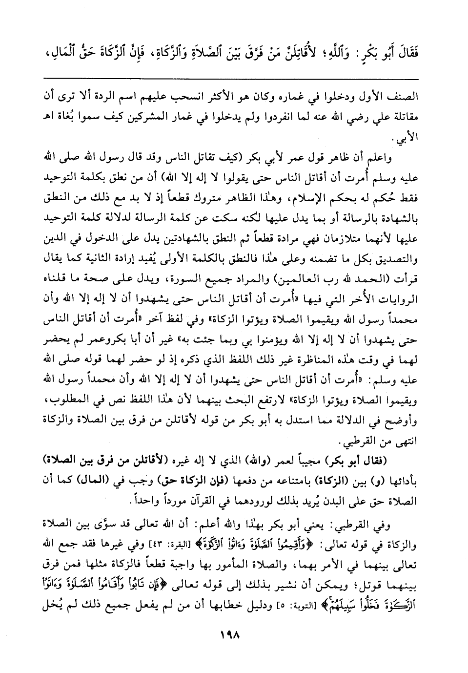 وفي القرطبي: يعني أبو بكر بهذا والله أعلم: أن الله تعالى قد سوَّى بين الصلاة والزكاة في قوله تعالى: {وَأَقِيمُوا الصَّلَاةَ وَآتُوا الزَّكَاةَ} [البقرة: ٤٣] وفي غيرها فقد جمع الله تعالى بينهما في الأمر بهما، والصلاة المأمور بها واجبة قطعًا فالزكاة مثلها فمن فرق بينهما قوتل؛ ويمكن أن نشير بذلك إلى قوله تعالى {فَإِنْ تَابُوا وَأَقَامُوا الصَّلَاةَ وَآتَوُا الزَّكَاةَ فَخَلُّوا سَبِيلَهُمْ} [التوبة: ٥] ودليل خطابها أن من لم يفعل جميع ذلك لم يُخل