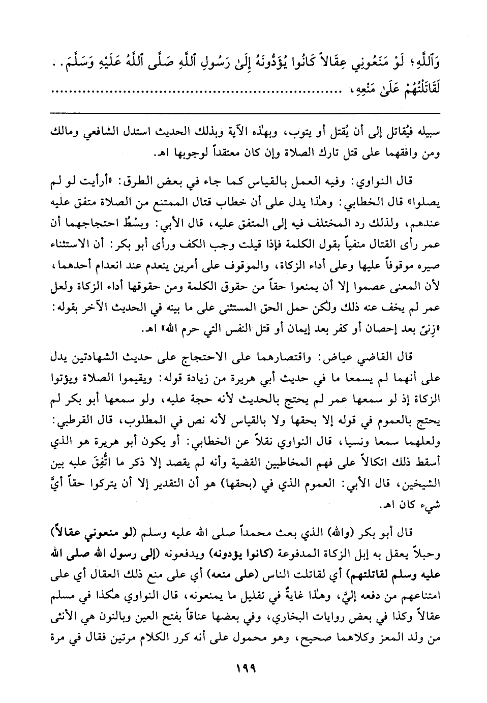 قال النواوي: وفيه العمل بالقياس كما جاء في بعض الطرق: "أرأيت لو لم يصلوا" قال الخطابي: وهذا يدل على أن خطاب قتال الممتنع من الصلاة متفق عليه عندهم، ولذلك رد المختلف فيه إلى المتفق عليه، قال الأبي: وبسْطُ احتجاجهما أن عمر رأى القتال منفيًّا بقول الكلمة فإذا قيلت وجب الكف ورأى أبو بكر: أن الاستثناء صيره موقوفًا عليها وعلى أداء الزكاة، والموقوف على أمرين ينعدم عند انعدام أحدهما، لأن المعنى عصموا إلا أن يمنعوا حقًّا من حقوق الكلمة ومن حقوقها أداء الزكاة ولعل عمر لم يخف عنه ذلك ولكن حمل الحق المستثنى على ما بينه في الحديث الآخر بقوله: "زِنىً بعد إحصان أو كفرٌ بعد إيمان أو قتل النفس التي حرم الله" اهـ.