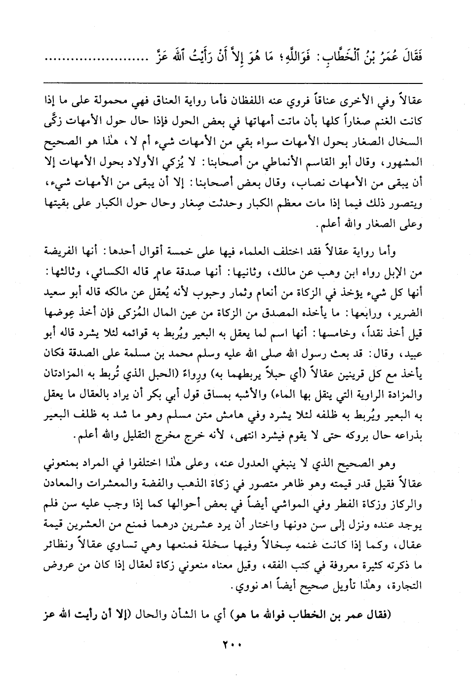 وهو الصحيح الذي لا ينبغي العدول عنه، وعلى هذا اختلفوا في المراد بمنعوني عقالًا فقيل قدر قيمته وهو ظاهر متصور في زكاة الذهب والفضة والمعشرات والمعادن والركاز وزكاة الفطر وفي المواشي أيضًا في بعض أحوالها كما إذا وجب عليه سن فلم يوجد عنده ونزل إلى سن دونها واختار أن يرد عشرين درهما فمنع من العشرين قيمة عقال، وكما إذا كانت غنمه سِخالًا وفيها سخلة فمنعها وهي تساوي عقالًا ونظائر ما ذكرته كثيرة معروفة في كتب الفقه، وقيل معناه منعوني زكاة لعقال إذا كان من عروض التجارة، وهذا تأويل صحيح أيضًا اهـ نووي.