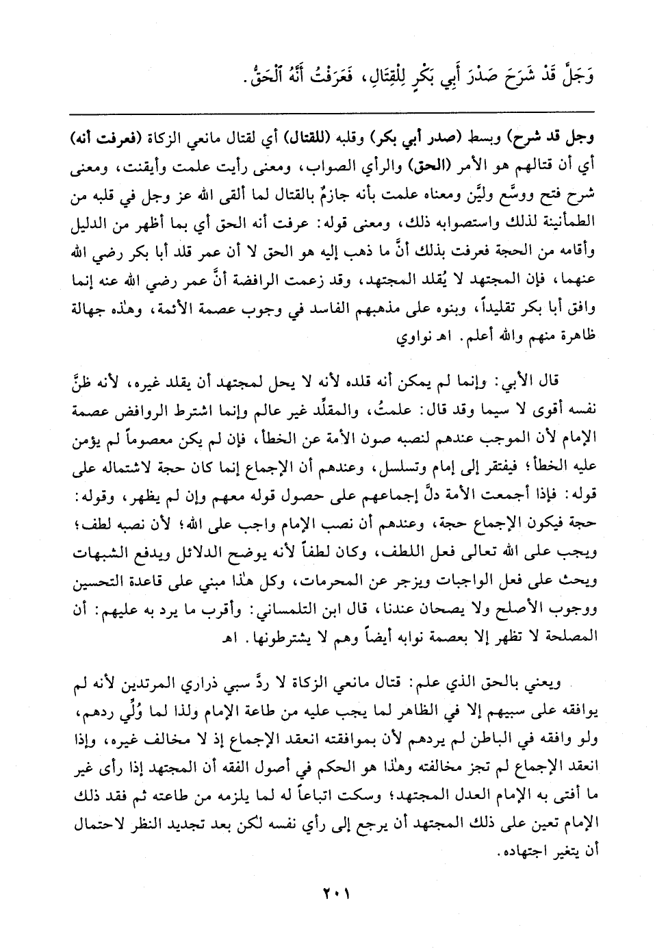 وجل قد شرح) وبسط (صدر أبي بكر) وقلبه (للقتال) أي لقتال مانعي الزكاة (فعرفت أنه) أي أن قتالهم هو الأمر (الحق) والرأي الصواب، ومعنى رأيت علمت وأيقنت، ومعنى شرح فتح ووسَّع وليَّن ومعناه علمت بأنه جازمٌ بالقتال لما ألقى الله عزَّ وجلَّ في قلبه من الطمأنينة لذلك واستصوابه ذلك، ومعنى قوله: عرفت أنه الحق أي بما أظهر من الدليل وأقامه من الحجة فعرفت بذلك أن ما ذهب إليه هو الحق لا أن عمر قلد أبا بكر رضي الله عنهما، فإن المجتهد لا يُقلد المجتهد، وقد زعمت الرافضة أن عمر رضي الله عنه إنما وافق أبا بكر تقليدًا، وبنوه على مذهبهم الفاسد في وجوب عصمة الأئمة، وهذه جهالة ظاهرة منهم والله أعلم. اهـ نواوي