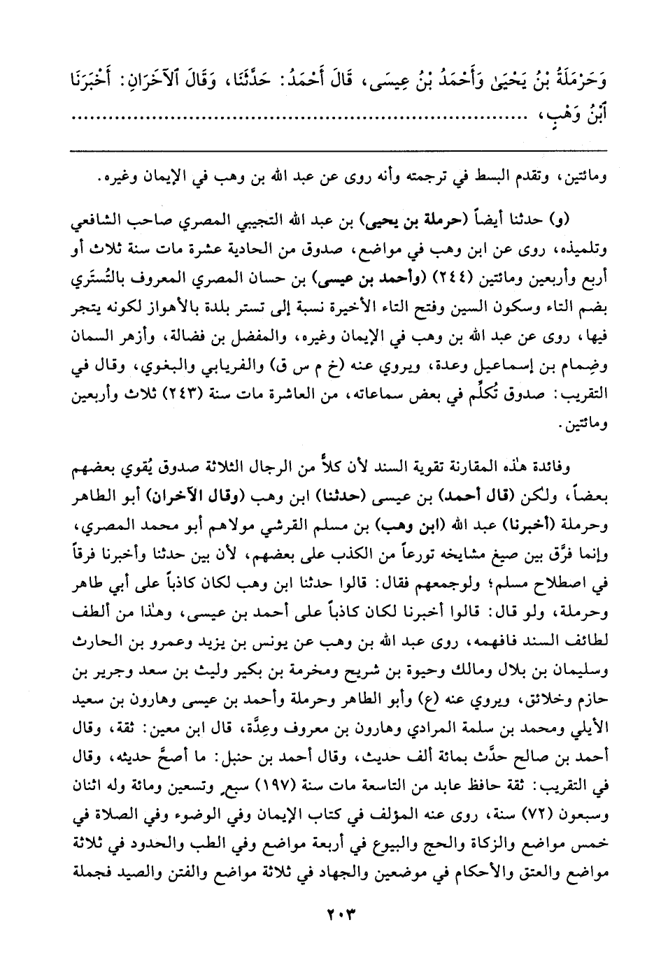 (و) حدثنا أيضًا (حرملة بن يحيى) بن عبد الله التجيبي المصري صاحب الشافعي وتلميذه، روى عن ابن وهب في مواضع، صدوق من الحادية عشرة مات سنة ثلاث أو أربع وأربعين ومائتين (٢٤٤) (وأحمد بن عيسى) بن حسان المصري المعروف بالتُستَري بضم التاء وسكون السين وفتح التاء الأخيرة نسبة إلى تستر بلدة بالأهواز لكونه يتجر فيها، روى عن عبد الله بن وهب في الإيمان وغيره، والمفضل بن فضالة، وأزهر السمان وضِمام بن إسماعيل وعدة، ويروي عنه (خ م س ق) والفريابي والبغوي، وقال في التقريب: صدوق تُكلِّم في بعض سماعاته، من العاشرة مات سنة (٢٤٣) ثلاث وأربعين ومائتين.
