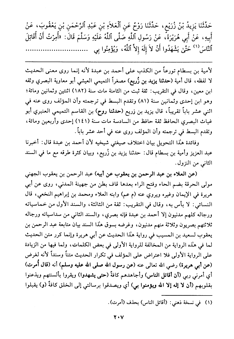 حَدَّثَنَا يَزِيدُ بْنُ زُرَيعٍ، حَدَّثَنَا رَوْحٌ عَنِ الْعَلاءِ بْنِ عَبْدِ الرَّحْمَنِ بْنِ يَعْقُوبَ، عَنْ أَبِيهِ، عَنْ أَبِي هُرَيرَةَ، عَنْ رَسُولِ اللهِ صَلَّى اللهُ عَلَيهِ وَسَلَّمَ قَال: "أُمِرْتُ أَنْ أُقَاتِلَ النَّاسَ (١) حَتى يَشْهَدُوا أَنْ لَا إِلَهَ إِلَّا اللهُ، ويؤْمِنُوا بِي
