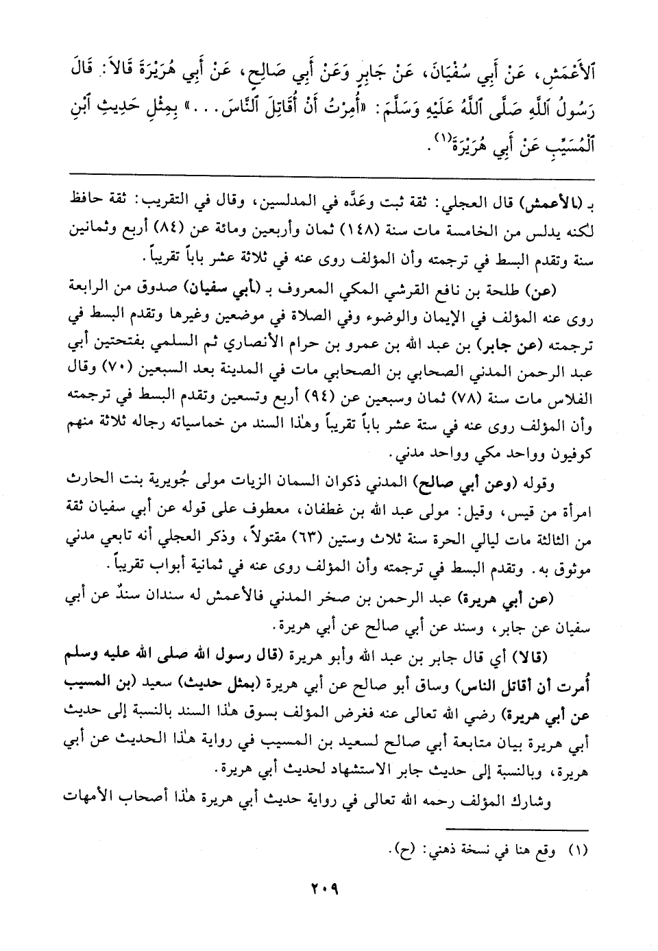 الأعمَشِ، عَن أَبِي سُفْيَانَ، عَنْ جَابِرٍ وَعَنْ أَبِي صَالِحٍ، عَنْ أَبِي هُرَيرَةَ قَالا: قَالَ رَسُولُ اللهِ صَلَّى اللهُ عَلَيهِ وَسَلَّمَ: "أُمِرْتُ أَنْ أُقَاتِلَ الناسَ ... " بِمِثْلِ حَدِيثِ ابْنِ الْمُسَيِّبِ عَنْ أَبِي هُرَيرَةَ (١)