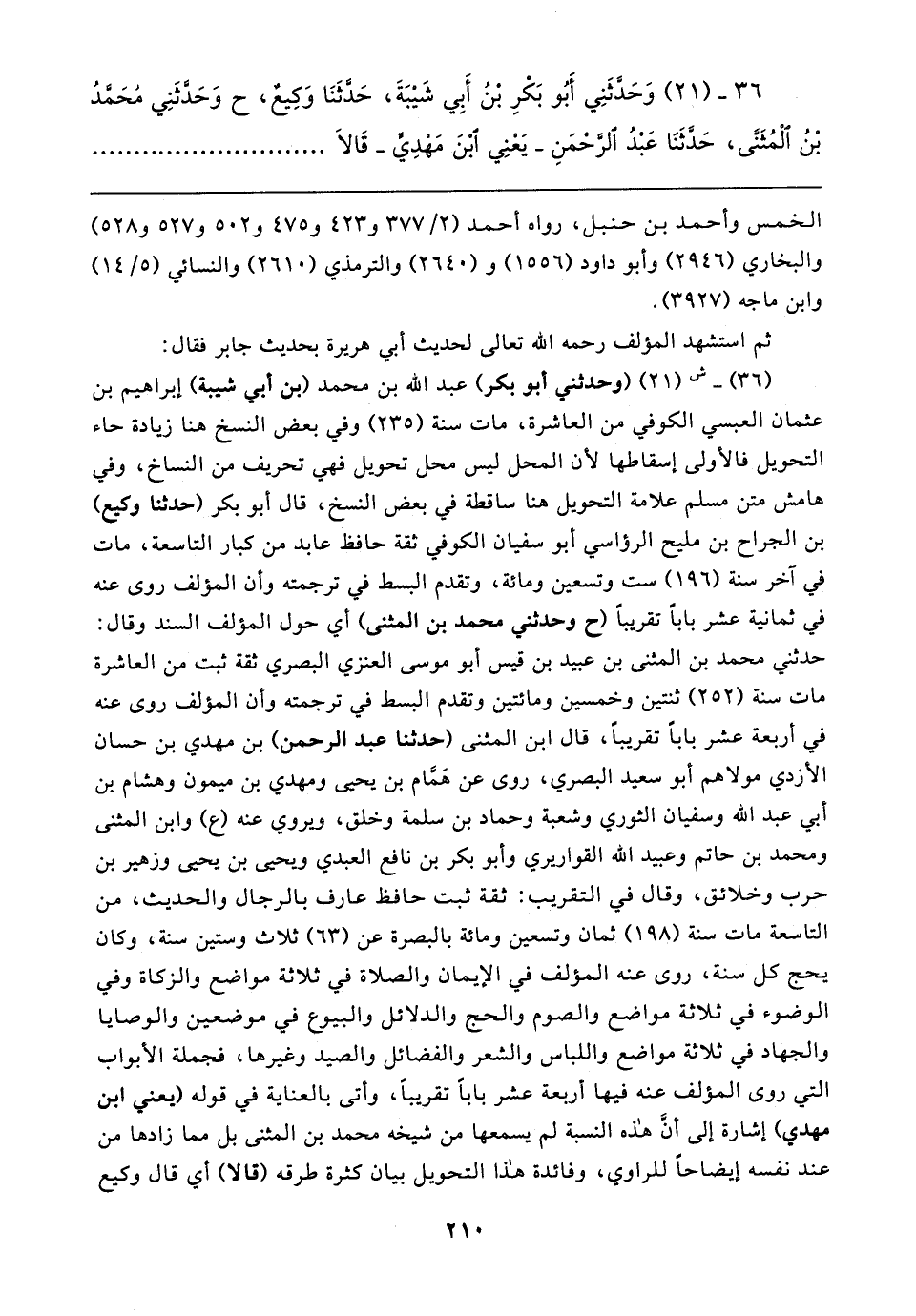 ٣٦ - (٢١) وَحَدَّثَنِي أَبُو بَكْرِ بن أَبِي شَيبَةَ، حَدَّثَنَا وَكِيعٌ، ح وَحَدَّثَنِي مُحَمَّدُ بْنُ الْمُثَنَّى، حَدَّثَنَا عَبْدُ الرَّحْمَنِ -يَعْنِي ابْنَ مَهْدِيٍّ- قَالا