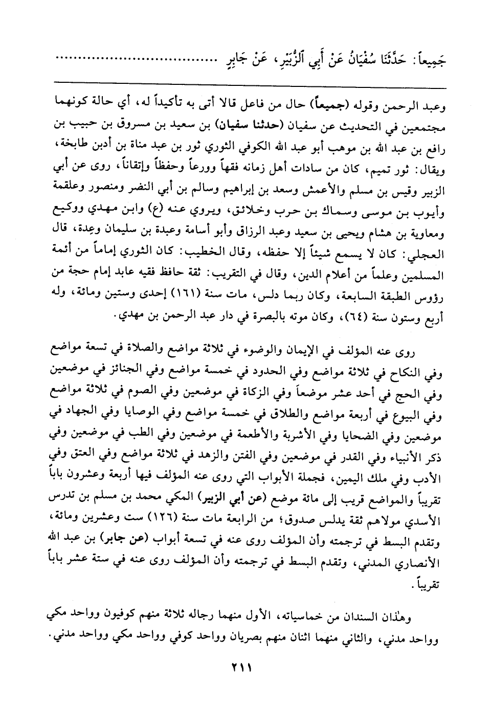 وعبد الرحمن وقوله (جميعًا) حال من فاعل قالا أتى به تأكيدًا له، أي حالة كونهما مجتمعين في التحديث عن سفيان (حدثنا سفيان) بن سعيد بن مسروق بن حبيب بن رافع بن عبد الله بن موهب أبو عبد الله الكوفي الثوري ثور بن عبد مناة بن أدبن طابخة، ويقال: ثور تميم، كان من سادات أهل زمانه فقهًا وورعًا وحفظًا وإتقانًا، روى عن أبي الزبير وقيس بن مسلم والأعمش وسعد بن إبراهيم وسالم بن أبي النضر ومنصور وعلقمة وأيوب بن موسى وسماك بن حرب وخلائق، ويروي عنه (ع) وابن مهدي ووكيع ومعاوية بن هشام ويحيى بن سعيد وعبد الرزاق وأبو أسامة وعبدة بن سليمان وعِدة، قال العجلي: كان لا يسمع شيئًا إلا حفظه، وقال الخطيب: كان الثوري إمامًا من أئمة المسلمين وعلمًا من أعلام الدين، وقال في التقريب: ثقة حافظ فقيه عابد إمام حجة من رؤوس الطبقة السابعة، وكان ربما دلس، مات سنة (١٦١) إحدى وستين ومائة، وله أربع وستون سنة (٦٤)، وكان موته بالبصرة في دار عبد الرحمن بن مهدي.