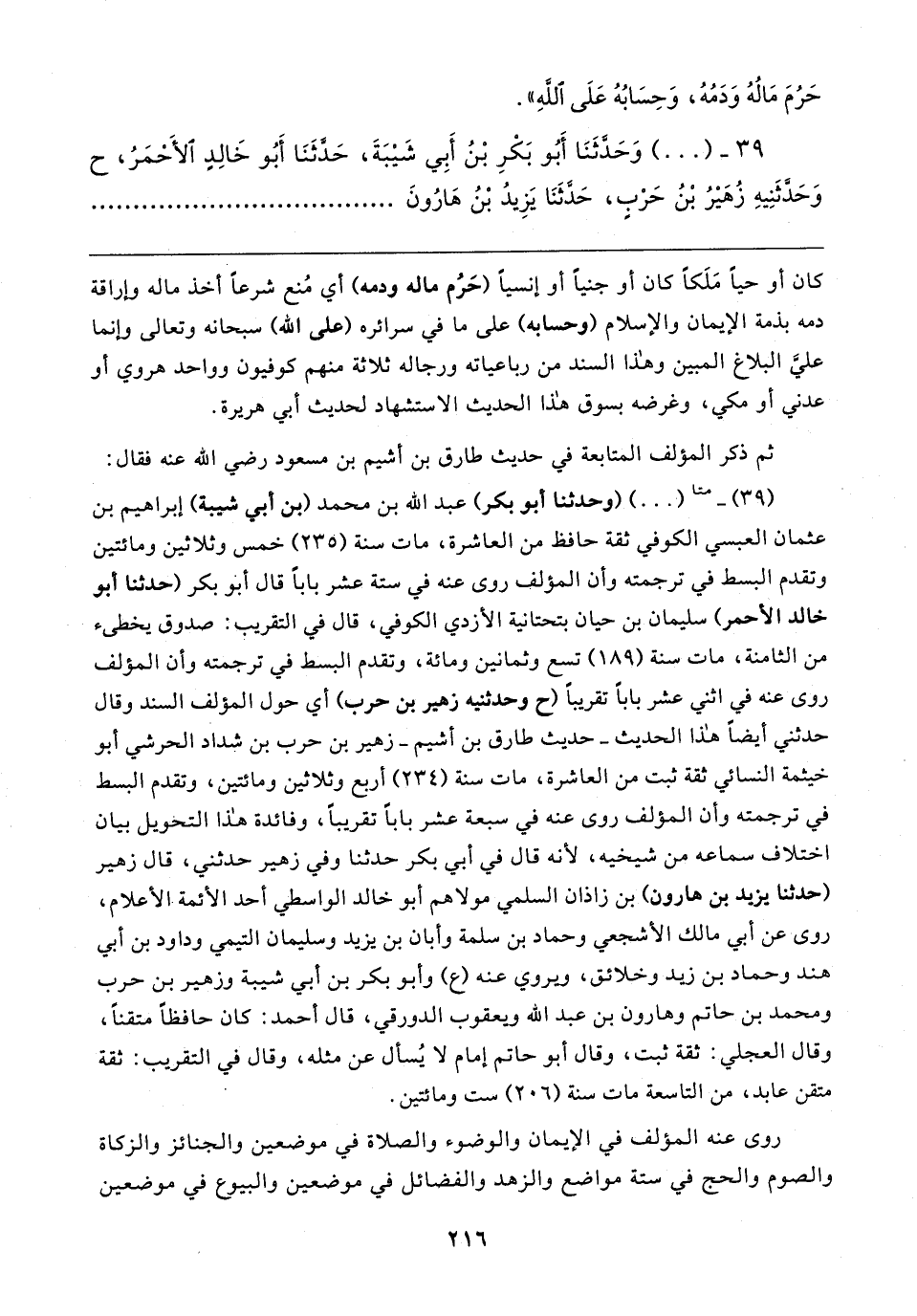 (٣٩) - متا (٠٠) (وحدثنا أبو بكر) عبد الله بن محمد (بن أبي شيبة) إبراهيم بن عثمان العبسي الكوفي ثقة حافظ من العاشرة، مات سنة (٢٣٥) خمس وثلاثين ومائتين وتقدم البسط في ترجمته وأن المؤلف روى عنه في ستة عشر بابا قال أبو بكر (حدثنا أبو خالد الأحمر) سليمان بن حيان بتحتانية الأزدي الكوفي، قال في التقريب: صدوق يخطئ من الثامنة، مات سنة (١٨٩) تسع وثمانين ومائة، وتقدم البسط في ترجمته وأن المؤلف روى عنه في اثني عشر بابا تقريبًا (خ وحدثنيه زهير بن حرب) أي حول المؤلف السند وقال حدثني أيضًا هذا الحديث -حديث طارق بن أشيم- زهير بن حرب بن شداد الحرشي أبو خيثمة النسائي ثقة ثبت من العاشرة، مات سنة (٢٣٤) أربع وثلاثين ومائتين، وتقدم البسط في ترجمته وأن المؤلف روى عنه في سبعة عشر بابا تقريبًا، وفائدة هذا التحويل بيان اختلاف سماعه من شيخيه، لأنه قال في أبي بكر حدثنا وفي زهير حدثني، قال زهير (حدثنا يزيد بن هارون) بن زاذان السلمي مولاهم أبو خالد الواسطي أحد الأئمة الأعلام، روى عن أبي مالك الأشجعي وحماد بن سلمة وأبان بن يزيد وسليمان التيمي وداود بن أبي هند وحماد بن زيد وخلائق، ويروي عنه (ع) وأبو بكر بن أبي شيبة وزهير بن حرب ومحمد بن حاتم وهارون بن عبد الله ويعقوب الدورقي، قال أحمد: كان حافظًا متقنًا، وقال العجلي: ثقة ثبت، وقال أبو حاتم إمام لا يُسأل عن مثله، وقال في التقريب: ثقة متقن عابد، من التاسعة مات سنة (٢٠٦) ست ومائتين.
