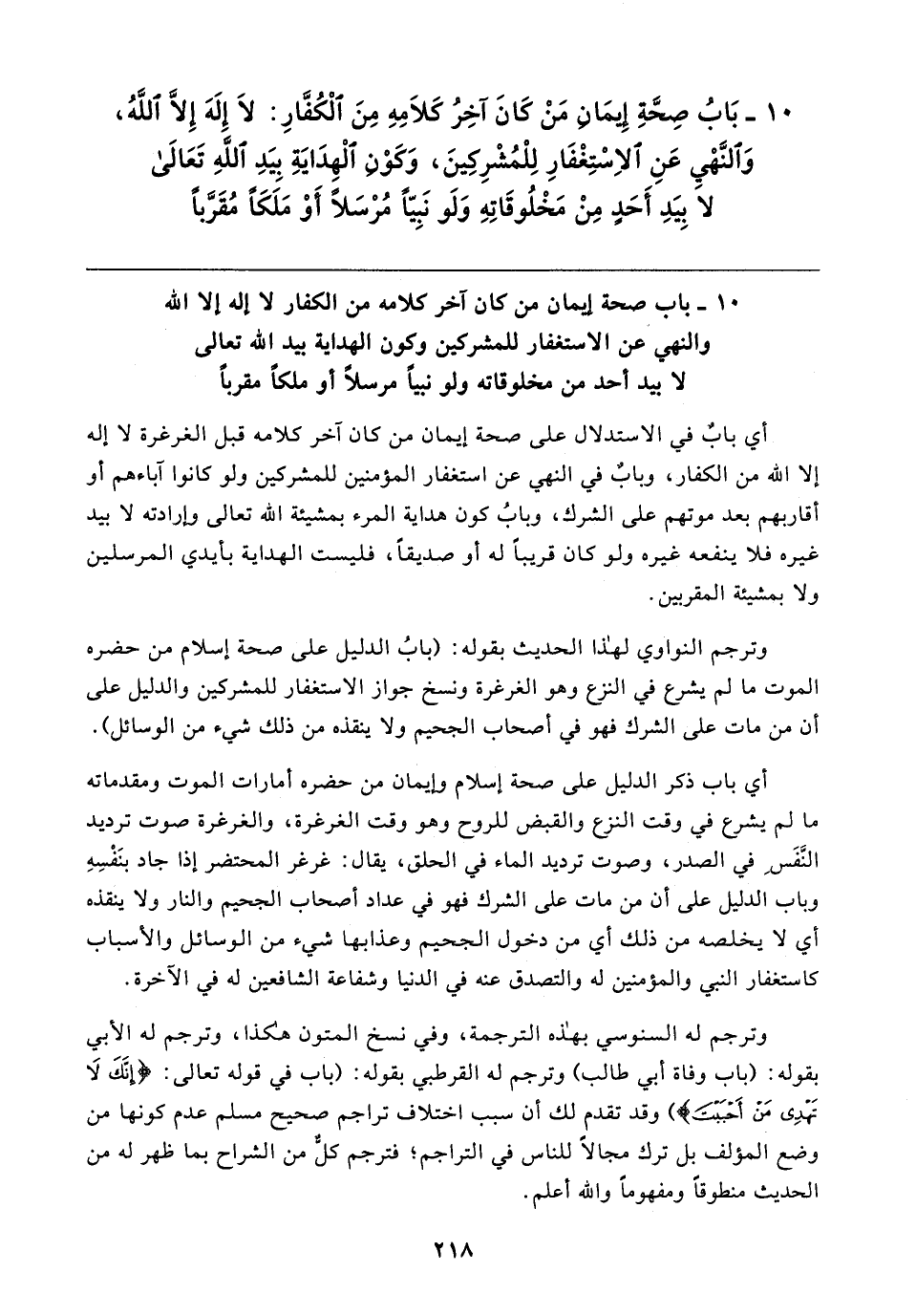 ١٠ - بَابُ صِحَّةِ إيمَانِ مَنْ كَانَ آخِرُ كَلامِهِ مِنَ الْكُفَّارِ: لَا إِلَهَ إِلَّا اللهُ، وَالنَّهْي عَنِ الاسْتِغْفَارِ لِلْمُشْرِكِينَ، وَكَوْنِ الْهِدَايَةِ بِيَدِ اللهِ تَعَالى لَا بِيَدِ أَحَدٍ مِنْ مَخْلُوقَاتِهِ وَلَو نَبِيًّا مُرْسَلًا أَوْ مَلَكًا مُقَرَّبًا
