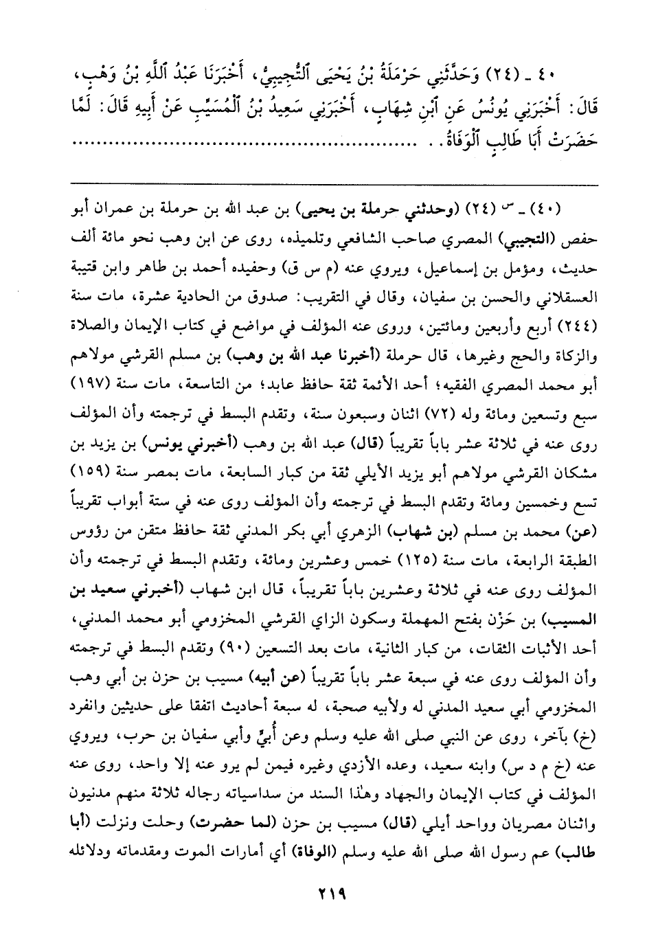 ٤٠ - (٢٤) وَحَدَّثَنِي حَرْمَلَةُ بْنُ يَحْيَى التُّجِيبِيُّ، أَخْبَرَنَا عَبْدُ اللهِ بْنُ وَهْبٍ، قَال: أَخْبَرَنِي يُونُسُ عَنِ ابْنِ شِهَابٍ، أَخْبَرَنِي سَعِيدُ بْنُ الْمُسَيِّبِ عَنْ أَبِيهِ قَال: لَمَّا حَضَرَتْ أَبَا طَالِبٍ الْوَفَاةُ