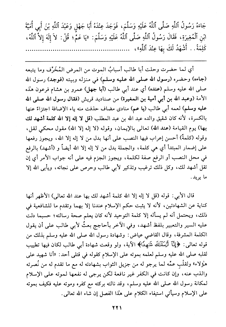 أي لما حضرت وحلت أبا طالب أسبابُ الموت من المرض المُخَرِّف وما يتبعه (جاءه) وحضره (رسول الله صلى الله عليه وسلم) في منزله وبيته (فوجد) رسول الله صلى الله عليه وسلم (عنده) أي عند أبي طالب (أبا جهل) عمرو بن هشام فرعون هذه الأمة (وعبد الله بن أبي أمية بن المغيرة) من صناديد قريش (فقال رسول الله صلى الله عليه وسلم) لعمه أبي طالب (يا عم) منادى مضاف حذفت منه ياء الإضافة اجتزاءً عنها بالكسرة، لأنه كان شقيق والده عبد الله بن عبد المطلب (قل لا إله إلا الله كلمة أشهد لك بها) يوم القيامة (عند الله) تعالى بالإيمان، وقوله (لا إله إلا الله) مقول محكي لقل، وقوله (كلمةً) أحسن إعراب فيها النصب على أنها بدل من لا إله إلا الله، ويجوز رفعها على إضمار المبتدأ أي هي كلمة، والجملة بدل من لا إله إلا الله أيضًا و (أشهد) بالرفع في محل النصب أو الرفع صفة لكلمة، ويجوز الجزم فيه على أنه جواب الأمر أي إن تقل أشهد لك، وكل ذلك ترغيب وتذكير لأبي طالب وحرص على نجاته، ويأبى الله إلا ما يريد.