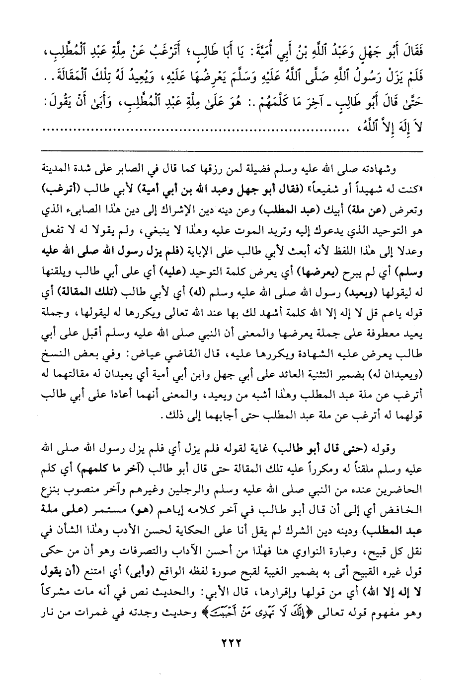 فَقَال أَبُو جَهْلٍ وَعَبْدُ اللهِ بْنُ أبِي أُمَيَّةَ: يَا أَبَا طَالِبٍ؛ أَتَرْغَبُ عَن مِلَّةِ عَبْدِ الْمُطَّلِبِ، فَلَمْ يَزَلْ رَسُولُ اللهِ صَلَّى اللهُ عَلَيهِ وَسَلَّمَ يَعْرِضُهَا عَلَيهِ، ويعِيدُ لَهُ تِلْكَ المَقَالةَ .. حَتى قَال أَبُو طَالِبٍ -آخِرَ مَا كَلَّمَهُمْ-: هُوَ عَلَى مِلَّةِ عَبْدِ الْمُطَّلِبِ، وَأَبَى أَنْ يَقُولَ: لَا إِلَهَ إِلَّا اللهُ،