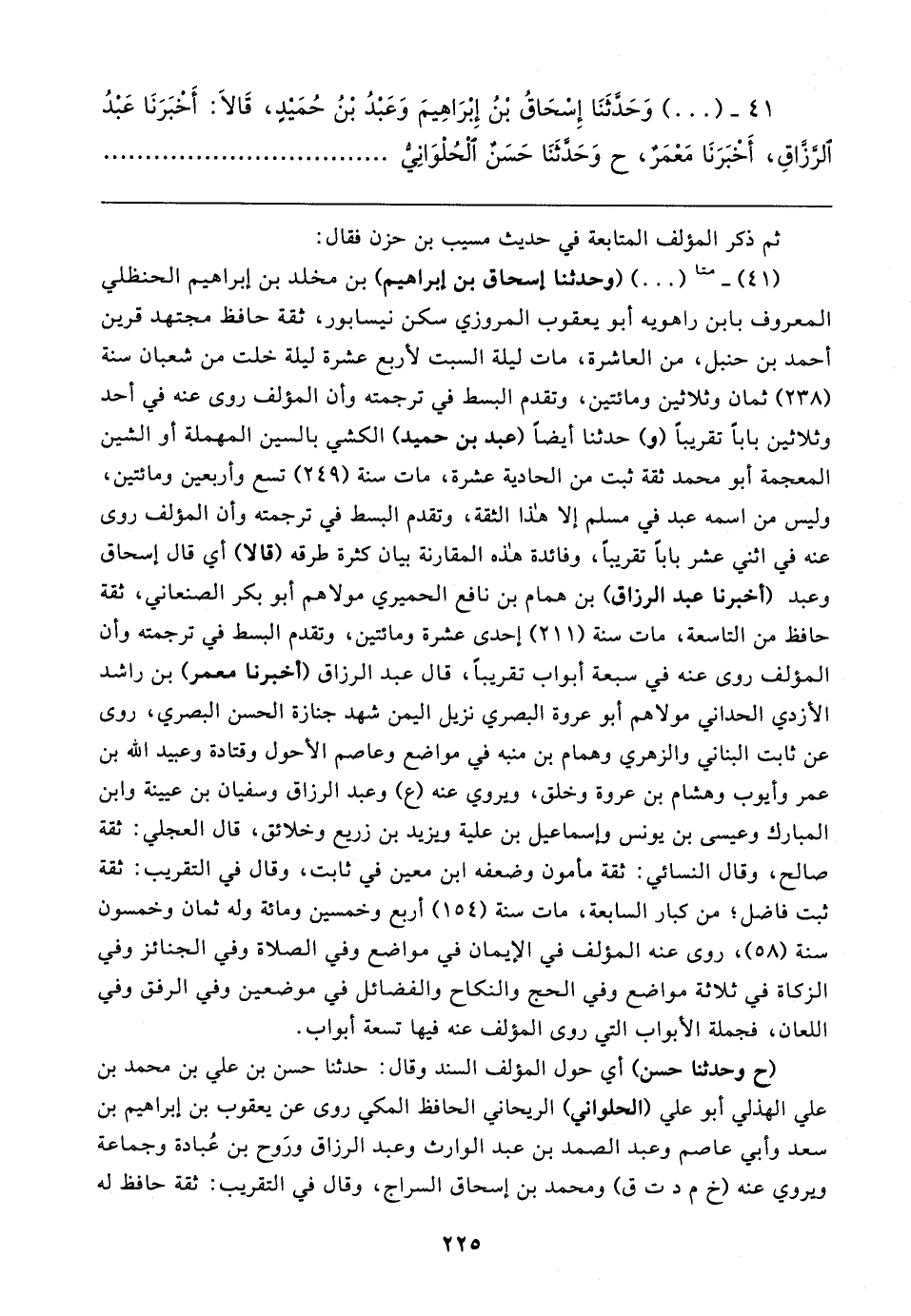(٤١) - متا (٠٠) (وحدثنا إسحاق بن إبراهيم) بن مخلد بن إبراهيم الحنظلي المعروف بابن راهويه أبو يعقوب المروزي سكن نيسابور، ثقة حافظ مجتهد قرين أحمد بن حنبل، من العاشرة، مات ليلة السبت لأربع عشرة ليلة خلت من شعبان سنة (٢٣٨) ثمان وثلاثين ومائتين، وتقدم البسط في ترجمته وأن المؤلف روى عنه في أحد وثلاثين بابًا تقريبًا (و) حدثنا أيضًا (عبد بن حميد) الكشي بالسين المهملة أو الشين المعجمة أبو محمد ثقة ثبت من الحادية عشرة، مات سنة (٢٤٩) تسع وأربعين ومائتين، وليس من اسمه عبد في مسلم إلا هذا الثقة، وتقدم البسط في ترجمته وأن المؤلف روى عنه في اثني عشر بابًا تقريبًا، وفائدة هذه المقارنة بيان كثرة طرقه (قالا) أي قال إسحاق وعبد (أخبرنا عبد الرزاق) بن همام بن نافع الحميري مولاهم أبو بكر الصنعاني، ثقة حافظ من التاسعة، مات سنة (٢١١) إحدى عشرة ومائتين، وتقدم البسط في ترجمته وأن المؤلف روى عنه في سبعة أبواب تقريبًا، قال عبد الرزاق (أخبرنا معمر) بن راشد الأزدي الحداني مولاهم أبو عروة البصري نزيل اليمن شهد جنازة الحسن البصري، روى عن ثابت البناني والزهري وهمام بن منبه في مواضع وعاصم الأحول وقتادة وعبيد الله بن عمر وأيوب وهشام بن عروة وخلق، ويروي عنه (ع) وعبد الرزاق وسفيان بن عيينة وابن المبارك وعيسى بن يونس وإسماعيل بن علية ويزيد بن زريع وخلائق، قال العجلي: ثقة صالح، وقال النسائي: ثقة مأمون وضعفه ابن معين في ثابت، وقال في التقريب: ثقة ثبت فاضل؛ من كبار السابعة، مات سنة (١٥٤) أربع وخمسين ومائة وله ثمان وخمسون سنة (٥٨)، روى عنه المؤلف في الإيمان في مواضع وفي الصلاة وفي الجنائز وفي الزكاة في ثلاثة مواضع وفي الحج والنكاح والفضائل في موضعين وفي الرفق وفي اللعان، فجملة الأبواب التي روى المؤلف عنه فيها تسعة أبواب.