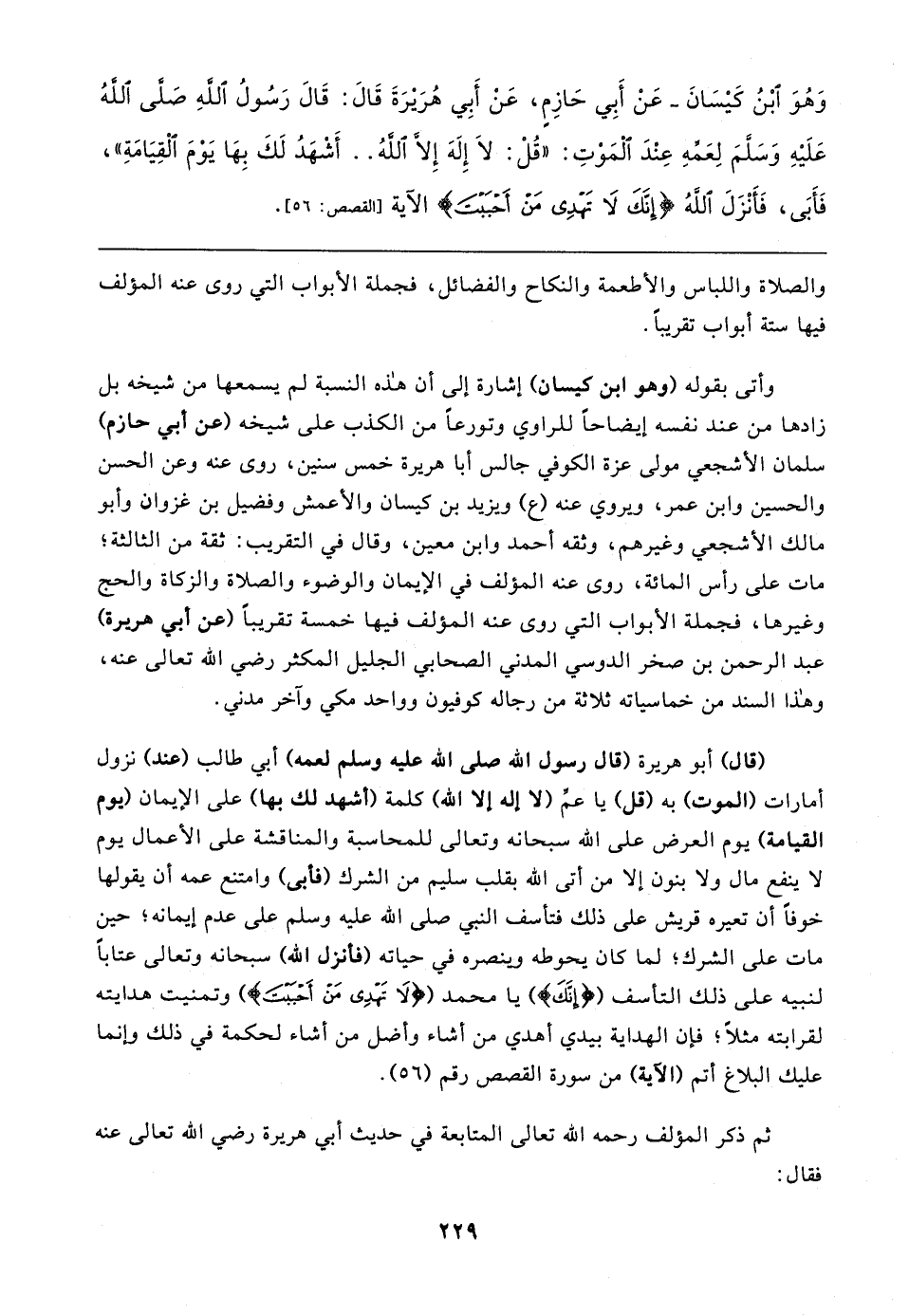 وَهُوَ ابْنُ كَيْسَانَ- عَنْ أبِي حَازِمٍ، عَنْ أَبِي هُرَيرَةَ قَال: قَال رَسُولُ اللهِ صَلَّى اللهُ عَلَيهِ وَسَلَّمَ لِعَمِّهِ عِنْدَ الْمَوْتِ: "قُلْ: لَا إِلَهَ إِلَّا اللهُ .. أَشْهَدُ لَكَ بِهَا يَوْمَ الْقِيَامَةِ"، فَأَبَى، فَأنْزَلَ اللهُ {إِنَّكَ لَا تَهْدِي مَنْ أَحْبَبْتَ} [القصص: ٥٦]