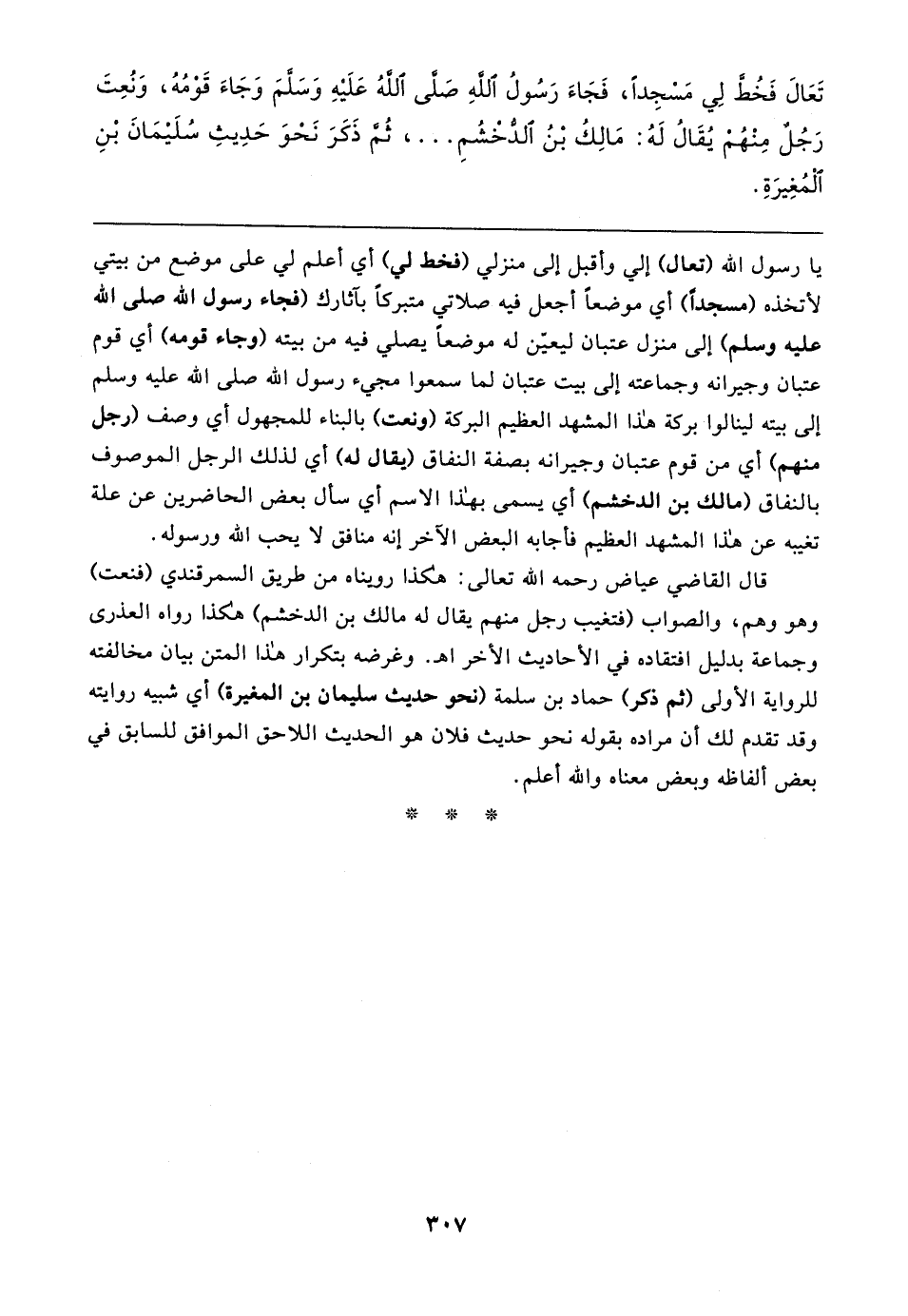 قال القاضي عياض رحمه الله تعالى: هكذا رويناه من طريق السمرقندي (فنعت) وهو وهم، والصواب (فتغيب رجل منهم يقال له مالك بن الدخشم) هكذا رواه العذرى وجماعة بدليل افتقاده في الأحاديث الأخر اهـ. وغرضه بتكرار هذا المتن بيان مخالفته للرواية الأولى (ثم ذكر) حماد بن سلمة (نحو حديث سليمان بن المغيرة) أي شبيه روايته وقد تقدم لك أن مراده بقوله نحو حديث فلان هو الحديث اللاحق الموافق للسابق في بعض ألفاظه وبعض معناه والله أعلم.