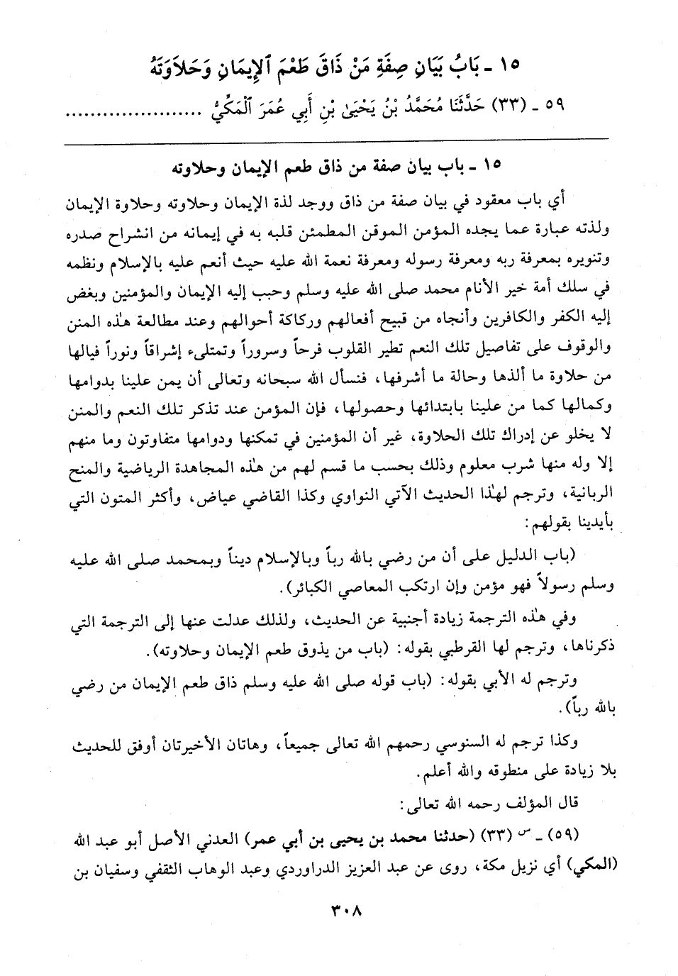 أي باب معقود في بيان صفة من ذاق ووجد لذة الإيمان وحلاوته وحلاوة الإيمان ولذته عبارة عما يجده المؤمن الموقن المطمئن قلبه به في إيمانه من انشراح صدره وتنويره بمعرفة ربه ومعرفة رسوله ومعرفة نعمة الله عليه حيث أنعم عليه بالإسلام ونظمه في سلك أمة خير الأنام محمد صلى الله عليه وسلم وحبب إليه الإيمان والمؤمنين وبغض إليه الكفر والكافرين وأنجاه من قبيح أفعالهم وركاكة أحوالهم وعند مطالعة هذه المنن والوقوف على تفاصيل تلك النعم تطير القلوب فرحًا وسرورًا وتمتلئ إشراقًا ونورًا فيالها من حلاوة ما ألذها وحالة ما أشرفها، فنسأل الله سبحانه وتعالى أن يمن علينا بدوامها وكمالها كما من علينا بابتدائها وحصولها، فإن المؤمن عند تذكر تلك النعم والمنن لا يخلو عن إدراك تلك الحلاوة، غير أن المؤمنين في تمكنها ودوامها متفاوتون وما منهم إلا وله منها شرب معلوم وذلك بحسب ما قسم لهم من هذه المجاهدة الرياضية والمنح الربانية، وترجم لهذا الحديث الآتي النواوي وكذا القاضي عياض، وأكثر المتون التي بأيدينا بقولهم: