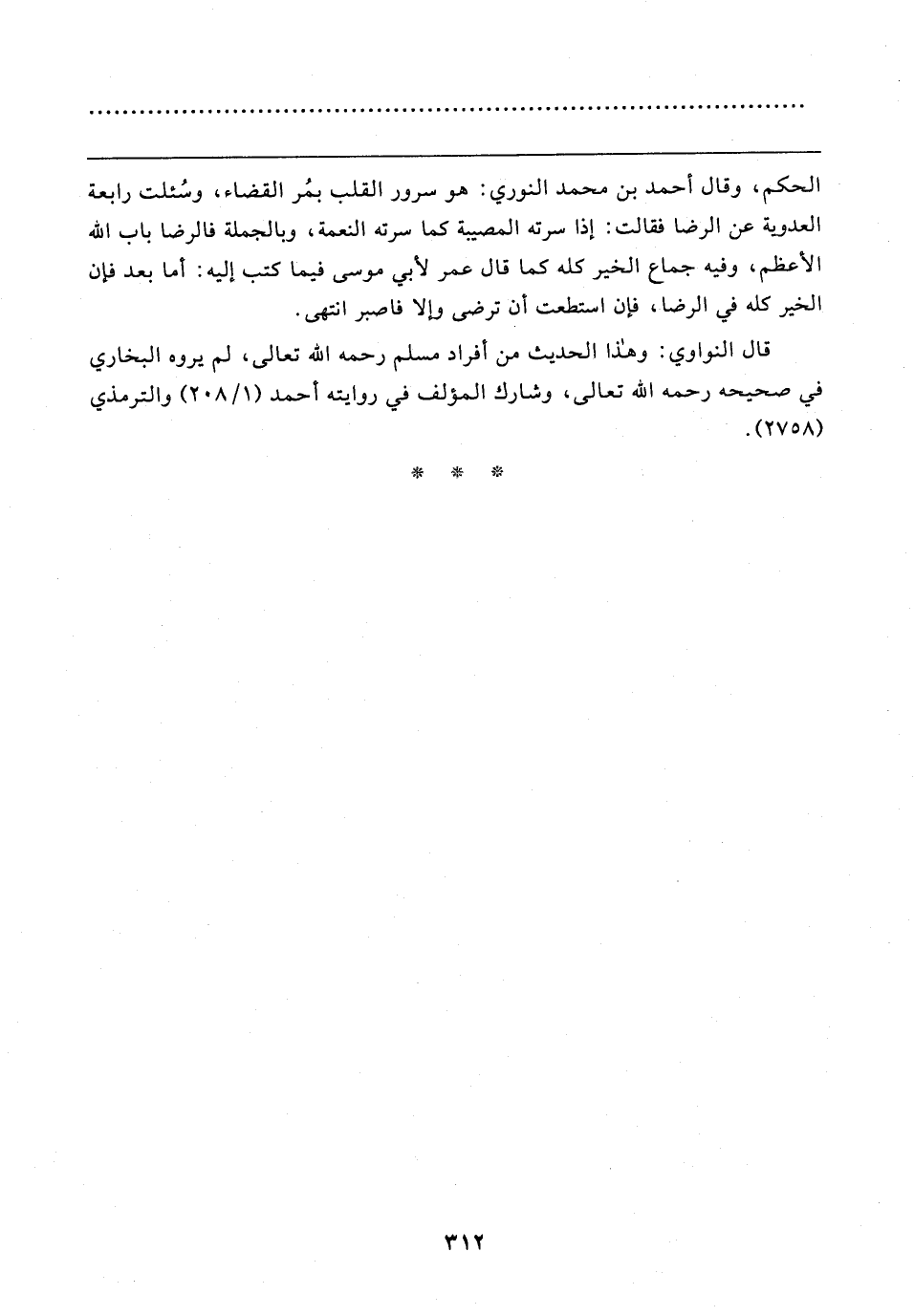 الحكم، وقال أحمد بن محمد النوري: هو سرور القلب بمُر القضاء، وسُئلت رابعة العدوية عن الرضا فقالت: إذا سرته المصيبة كما سرته النعمة، وبالجملة فالرضا باب الله الأعظم، وفيه جماع الخير كله كما قال عمر لأبي موسى فيما كتب إليه: أما بعد فإن الخير كله في الرضا، فإن استطعت أن ترضى وإلا فاصبر انتهى.