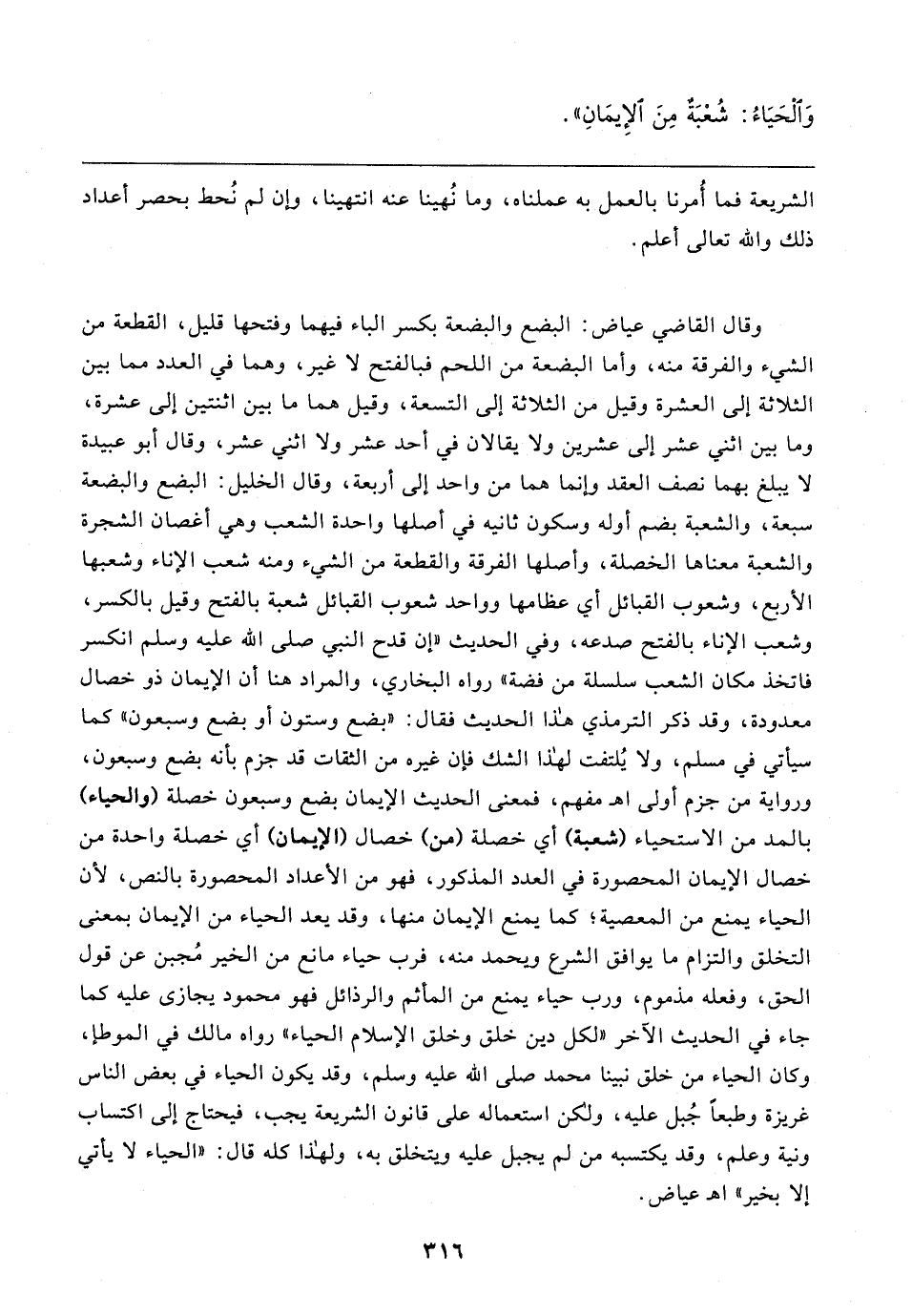 وقال القاضي عياض: البضع والبضعة بكسر الباء فيهما وفتحها قليل، القطعة من الشيء والفرقة منه، وأما البضعة من اللحم فبالفتح لا غير، وهما في العدد مما بين الثلاثة إلى العشرة وقيل من الثلاثة إلى التسعة، وقيل هما ما بين اثنتين إلى عشرة، وما بين اثني عشر إلى عشرين ولا يقالان في أحد عشر ولا اثني عشر، وقال أبو عبيدة لا يبلغ بهما نصف العقد وإنما هما من واحد إلى أربعة، وقال الخليل: البضع والبضعة سبعة، والشعبة بضم أوله وسكون ثانيه في أصلها واحدة الشعب وهي أغصان الشجرة والشعبة معناها الخصلة، وأصلها الفرقة والقطعة من الشيء ومنه شعب الإناء وشعبها الأربع، وشعوب القبائل أي عظامها وواحد شعوب القبائل شعبة بالفتح وقيل بالكسر، وشعب الإناء بالفتح صدعه، وفي الحديث "إن قدح النبي صلى الله عليه وسلم انكسر فاتخذ مكان الشعب سلسلة من فضة" رواه البخاري، والمراد هنا أن الإيمان ذو خصال معدودة، وقد ذكر الترمذي هذا الحديث فقال: "بضع وستون أو بضع وسبعون" كما سيأتي في مسلم، ولا يُلتفت لهذا الشك فإن غيره من الثقات قد جزم بأنه بضع وسبعون، ورواية من جزم أولى اهـ مفهم، فمعنى الحديث الإيمان بضع وسبعون خصلة (والحياء) بالمد من الاستحياء (شعبة) أي خصلة (من) خصال (الإيمان) أي خصلة واحدة من خصال الإيمان المحصورة في العدد المذكور، فهو من الأعداد المحصورة بالنص، لأن الحياء يمنع من المعصية؛ كما يمنع الإيمان منها، وقد يعد الحياء من الإيمان بمعنى التخلق والتزام ما يوافق الشرع ويحمد منه، فرب حياء مانع من الخير مُجبن عن قول الحق، وفعله مذموم، ورب حياء يمنع من المأث والرذائل فهو محمود يجازى عليه كما جاء في الحديث الآخر "لكل دين خلق وخلق الإسلام الحياء" رواه مالك في الموطإ، وكان الحياء من خلق نبينا محمد صلى الله عليه وسلم، وقد يكون الحياء في بعض الناس غريزة وطبعًا جُبل عليه، ولكن استعماله على قانون الشريعة يجب، فيحتاج إلى اكتساب ونية وعلم، وقد يكتسبه من لم يجبل عليه ويتخلق به، ولهذا كله قال: "الحياء لا يأتي إلا بخير" اهـ عياض.
