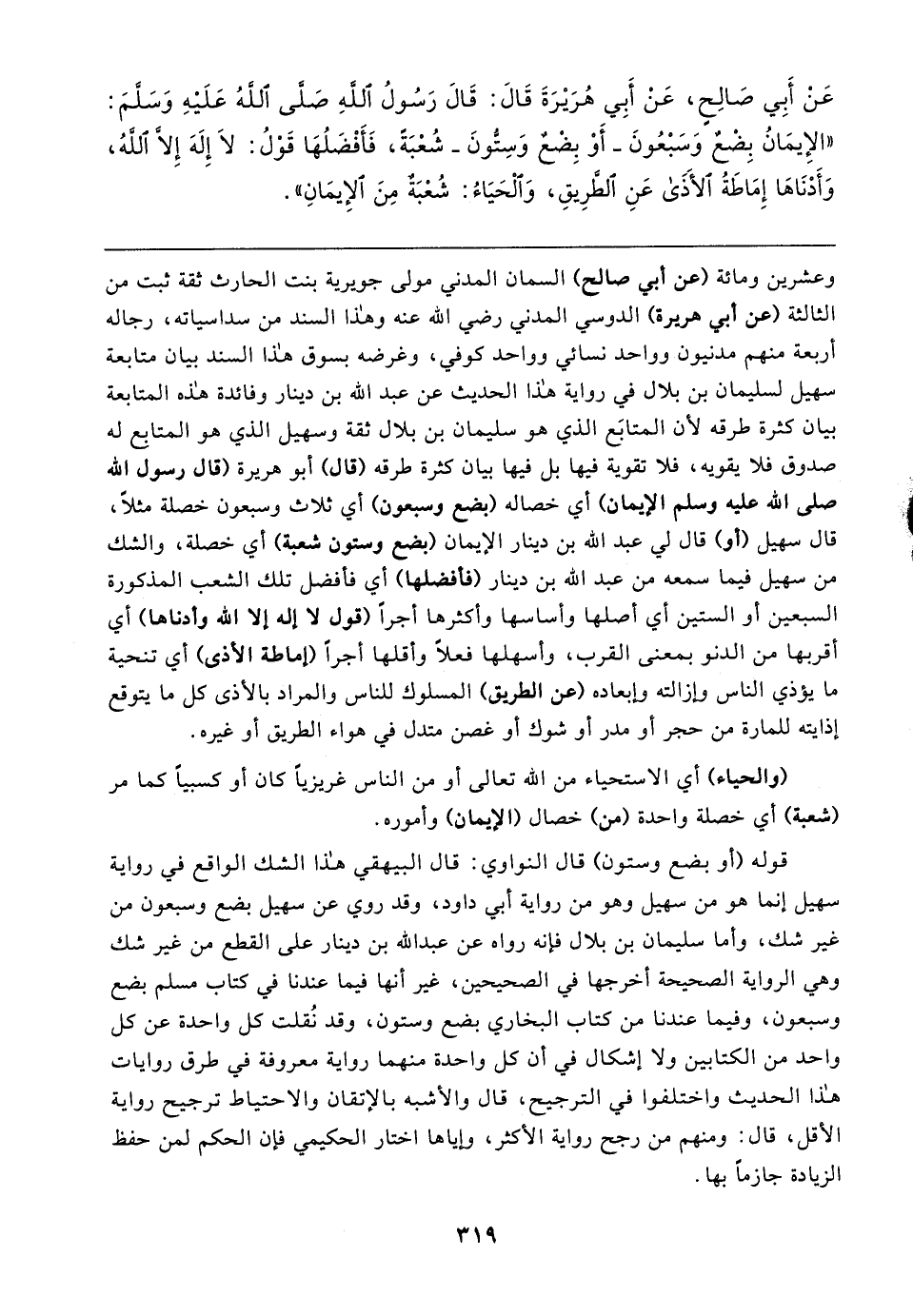 عَنْ أبِي صَالِحٍ، عَنْ أبِي هُرَيرَةَ قَال: قَال رَسُولُ اللهِ صَلى اللهُ عَلَيهِ وَسَلمَ: "الإِيمَانُ بِضْعٌ وَسَبْعُونَ -أوْ بِضْعٌ وَسِتُّونَ- شُعْبَةً، فَأَفْضَلُهَا قَوْلُ: لَا إِلَهَ إِلَّا اللهُ، وَأَدْنَاهَا إِمَاطَةُ الأَذَى عَنِ الطَّرِيقِ، وَالْحَيَاءُ: شُعْبَةٌ مِنَ الإِيمَانِ"
