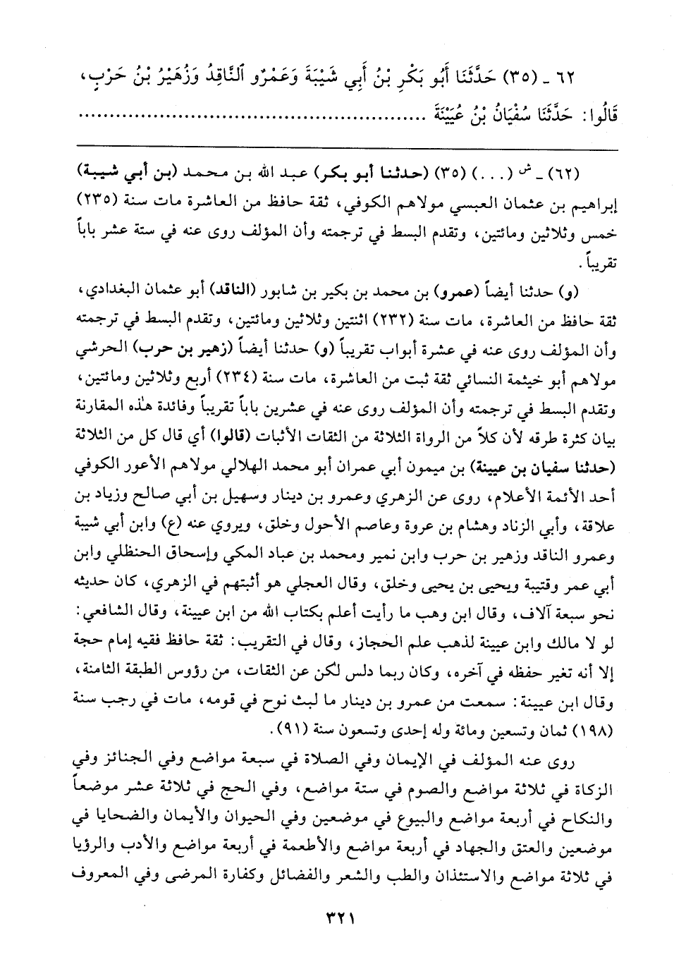 ٦٢ - (٣٥) حَدَّثَنَا أَبُو بَكْرِ بْنُ أَبِي شَيبَةَ وَعَمْرٌو النَّاقِدُ وَزُهَيرُ بْنُ حَرْبٍ، قَالُوا: حَدَّثَنَا سُفْيَانُ بْنُ عُيَينَةَ