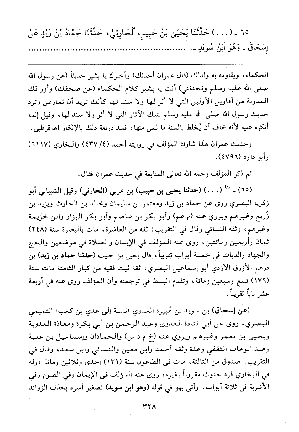 ٦٥ - (٠٠) حَدَّثَنَا يَحْيَى بْنُ حَبِيبٍ الْحَارِثِي، حَدَّثَنَا حَمَّادُ بْنُ زيدٍ عَنْ إِسْحَاقَ -وَهُوَ ابْنُ سُوَيدٍ-:
