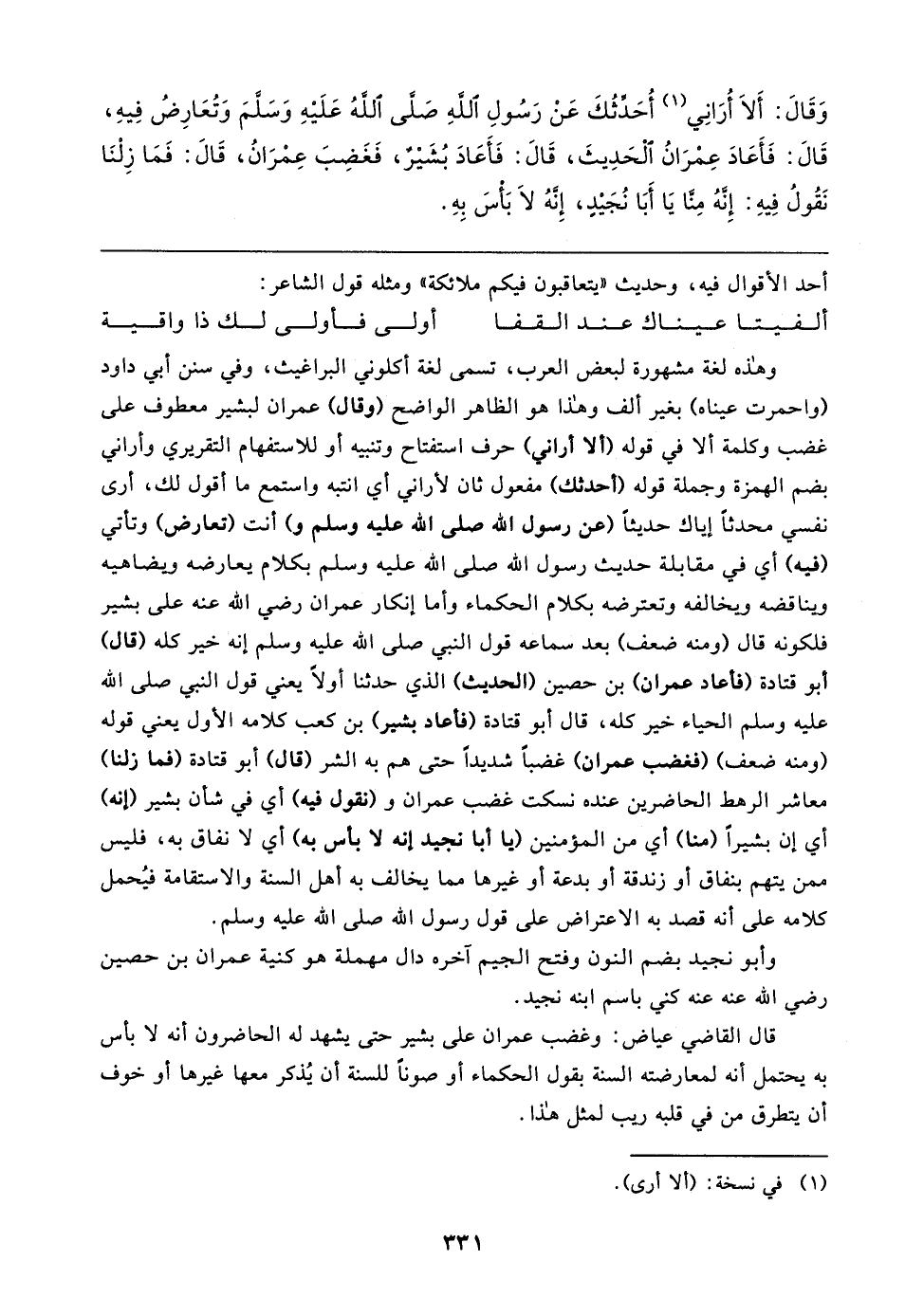 وَقَال: أَلا أُرَانِي (١) أُحَدِّثُكَ عَنْ رَسُولِ اللهِ صَلى اللهُ عَلَيهِ وَسَلَّمَ وَتُعَارِضُ فِيهِ، قَال: فَأَعَادَ عِمْرَانُ الْحَدِيثَ، قَال: فَأَعَادَ بُشَيرٌ، فَغَضِبَ عِمْرَانُ، قَال: فَمَا زِلْنَا نَقُولُ فِيهِ: إِنَّهُ مِنَّا يَا أَبَا نُجَيدٍ، إِنَّهُ لَا بَأسَ بِهِ