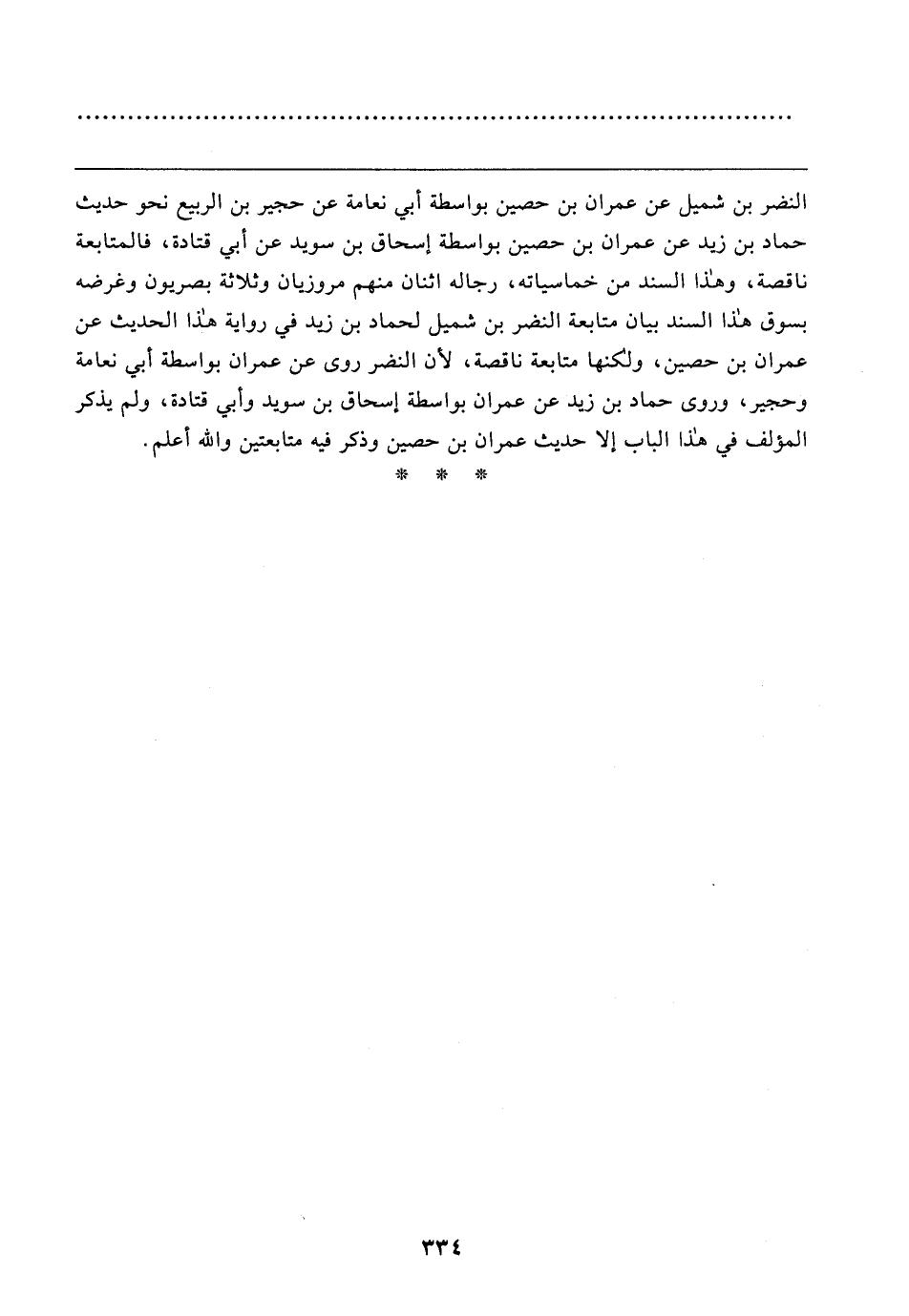 النضر بن شميل عن عمران بن حصين بواسطة أبي نعامة عن حجير بن الربيع نحو حديث حماد بن زيد عن عمران بن حصين بواسطة إسحاق بن سويد عن أبي قتادة، فالمتابعة ناقصة، وهذا السند من خماسياته، رجاله اثنان منهم مروزيان وثلاثة بصريون وغرضه بسوق هذا السند بيان متابعة النضر بن شميل لحماد بن زيد في رواية هذا الحديث عن عمران بن حصين، ولكنها متابعة ناقصة، لأن النضر روى عن عمران بواسطة أبي نعامة وحجير، وروى حماد بن زيد عن عمران بواسطة إسحاق بن سويد وأبي قتادة، ولم يذكر المؤلف في هذا الباب إلا حديث عمران بن حصين وذكر فيه متابعتين والله أعلم.