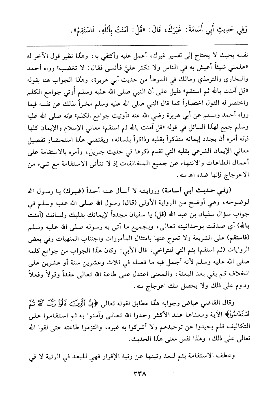 وقال القاضي عياض وجوابه هذا مطابق لقوله تعالى {إِنَّ الَّذِينَ قَالُوا رَبُّنَا اللَّهُ ثُمَّ اسْتَقَامُوا} الآية ومعناها عند الأكثر وحدوا الله تعالى وآمنوا به ثم استقاموا على التكاليف فلم يحيدوا عن توحيدهم ولا أشركوا به غيره، والتزموا طاعته حتى لقوا الله تعالى على ذلك، وهذا نفس معنى هذا الحديث.