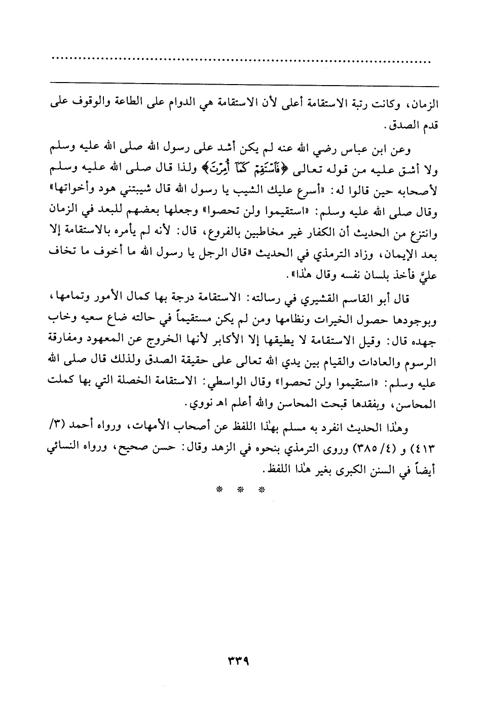 قال أبو القاسم القشيري في رسالته: الاستقامة درجة بها كمال الأمور وتمامها، وبوجودها حصول الخيرات ونظامها ومن لم يكن مستقيمًا في حالته ضاع سعيه وخاب جهده قال: وقيل الاستقامة لا يطيقها إلا الأكابر لأنها الخروج عن المعهود ومفارقة الرسوم والعادات والقيام بين يدي الله تعالى على حقيقة الصدق ولذلك قال صلى الله عليه وسلم: "استقيموا ولن تحصوا" وقال الواسطي: الاستقامة الخصلة التي بها كملت المحاسن، وبفقدها قبحت المحاسن والله أعلم اهـ نووي.