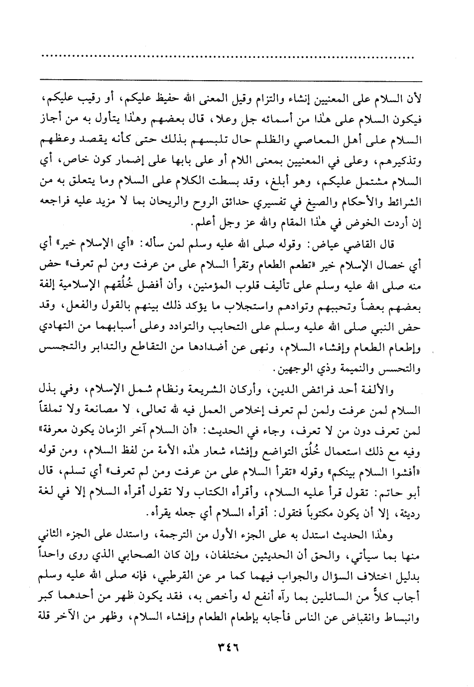 قال القاضي عياض: وقوله صلى الله عليه وسلم لمن سأله: "أي الإسلام خير" أي أي خصال الإسلام خير "تطعم الطعام وتقرأ السلام على من عرفت ومن لم تعرف" حض منه صلى الله عليه وسلم على تأليف قلوب المؤمنين، وأن أفضل خُلُقهم الإسلامية إلفة بعضهم بعضًا وتحببهم وتوادهم واستجلاب ما يؤكد ذلك بينهم بالقول والفعل، وقد حض النبي صلى الله عليه وسلم على التحابب والتوادد وعلى أسبابهما من التهادي وإطعام الطعام وإفشاء السلام، ونهى عن أضدادها من التقاطع والتدابر والتجسس والتحسس والنميمة وذي الوجهين.
