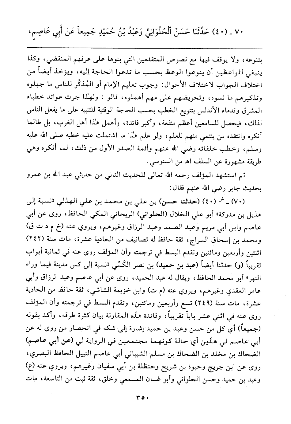 (٧٠) - ش (٤٠) (حدثنا حسن) بن علي بن محمد بن علي الهذلي "نسبة إلى هذيل بن مدركة" أبو علي الخلال (الحلواني) الريحاني المكي الحافظ، روى عن أبي عاصم وابن أبي مريم وعبد الصمد وعبد الرزاق وغيرهم، ويروي عنه (خ م د ت ق) ومحمد بن إسحاق السراج، ثقة حافظ له تصانيف من الحادية عشرة، مات سنة (٢٤٢) اثنتين وأربعين ومائتين وتقدم البسط في ترجمته وأن المؤلف روى عنه في ثمانية أبواب تقريبًا (و) حدثنا أيضًا (عبد بن حميد) بن نصر الكَسِّي "نسبة إلى كس مدينة فيما وراء النهر" أبو محمد الحافظ، ويقال له عبد الحميد، روى عن أبي عاصم وعبد الرزاق وأبي عامر العقدي وغيرهم، ويروي عنه (م ت) وابن خزيمة الشاشي، ثقة حافظ من الحادية عشرة، مات سنة (٢٤٩) تسع وأربعين ومائتين، وتقدم البسط في ترجمته وأن المؤلف روى عنه في اثني عشر بابًا تقريبًا، وفائدة هذه المقارنة بيان كثرة طرقه، وأكد بقوله (جميعًا) أي كل من حسن وعبد بن حميد إشارة إلى شكه في انحصار من روى له عن أبي عاصم في هذين أي حالة كونهما مجتمعين في الرواية لي (عن أبي عاصم) الضحاك بن مخلد بن الضحاك بن مسلم الشيباني أبي عاصم النبيل الحافظ البصري، روى عن ابن جريج وحيوة بن شريح وحنظلة بن أبي سفيان وغيرهم، ويروي عنه (ع) وعبد بن حميد وحسن الحلواني وأبو غسان المسمعي وخلق، ثقة ثبت من التاسعة، مات