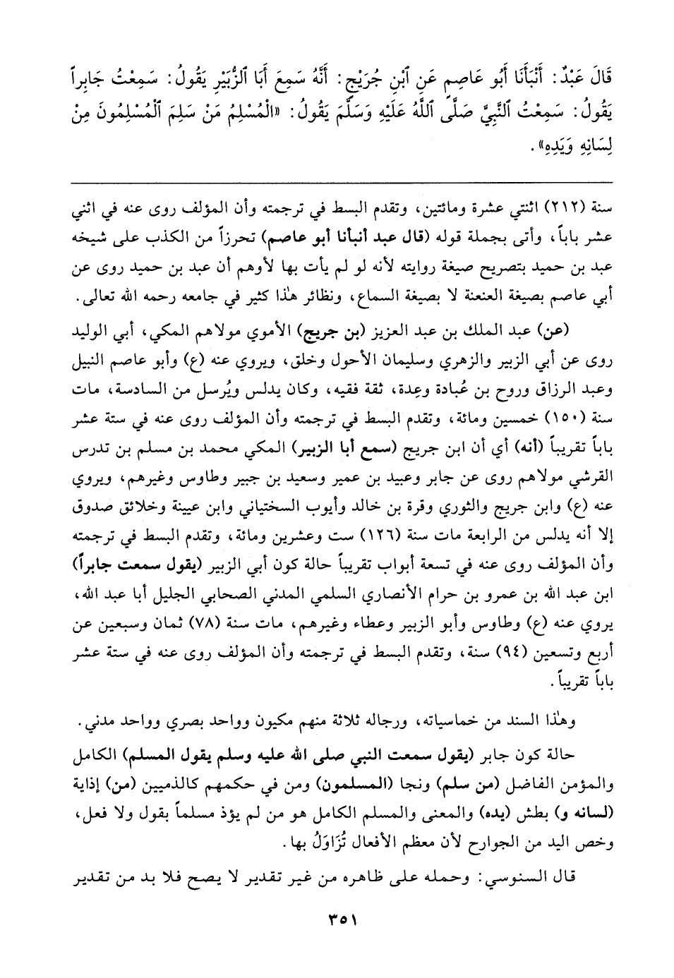 قَال عَبْدٌ: أَنْبَأَنَا أَبُو عَاصِمٍ عَنِ ابْنِ جُرَيجٍ: أَنَّهُ سَمِعَ أَبَا الزُّبَيرِ يَقُولُ: سَمِعْتُ جَابِرًا يَقُولُ: سَمِعْتُ النَّبِيَّ صَلَّى اللهُ عَلَيهِ وَسَلَّمَ يَقُولُ: "الْمُسْلِمُ مَنْ سَلِمَ الْمُسْلِمُونَ مِنْ لِسَانِهِ وَيَدِهِ"
