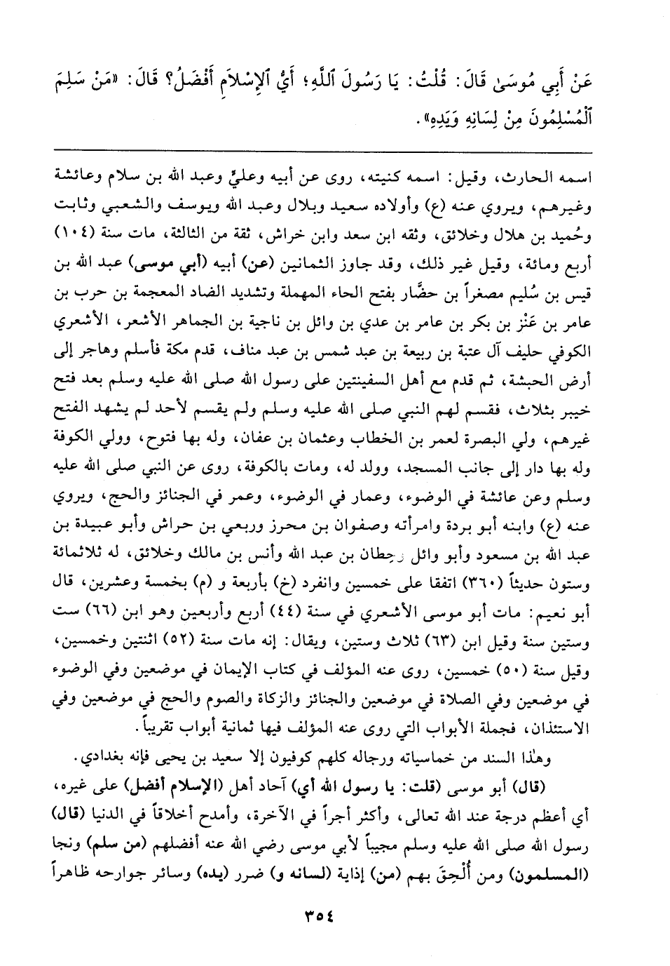 عَنْ أَبِي مُوسَى قَال: قُلْتُ: يَا رَسُولَ اللهِ؛ أَيُّ الإِسْلامِ أَفْضَلُ؟ قَال: "مَن سَلِمَ الْمُسْلِمُونَ مِنْ لِسَانِهِ وَيَدِهِ"