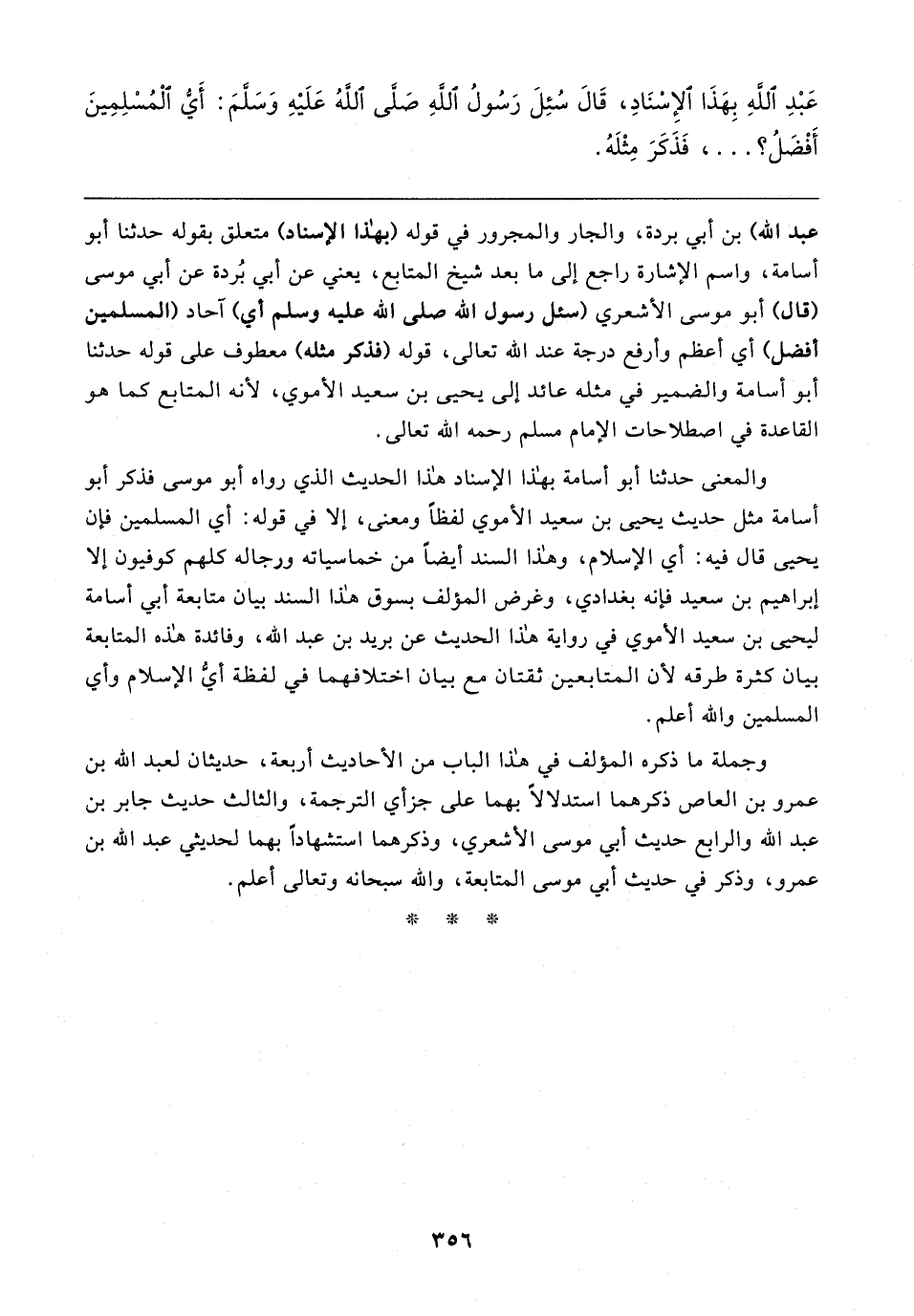 عبد الله) بن أبي بردة، والجار والمجرور في قوله (بهذا الإسناد) متعلق بقوله حدثنا أبو أسامة، واسم الإشارة راجع إلى ما بعد شيخ المتابع، يعني عن أبي بُردة عن أبي موسى (قال) أبو موسى الأشعري (سئل رسول الله صلى الله عليه وسلم أي) آحاد (المسلمين أفضل) أي أعظم وأرفع درجة عند الله تعالى، قوله (فذكر مثله) معطوف على قوله حدثنا أبو أسامة والضمير في مثله عائد إلى يحيى بن سعيد الأموي، لأنه المتابع كما هو القاعدة في اصطلاحات الإمام مسلم رحمه الله تعالى.