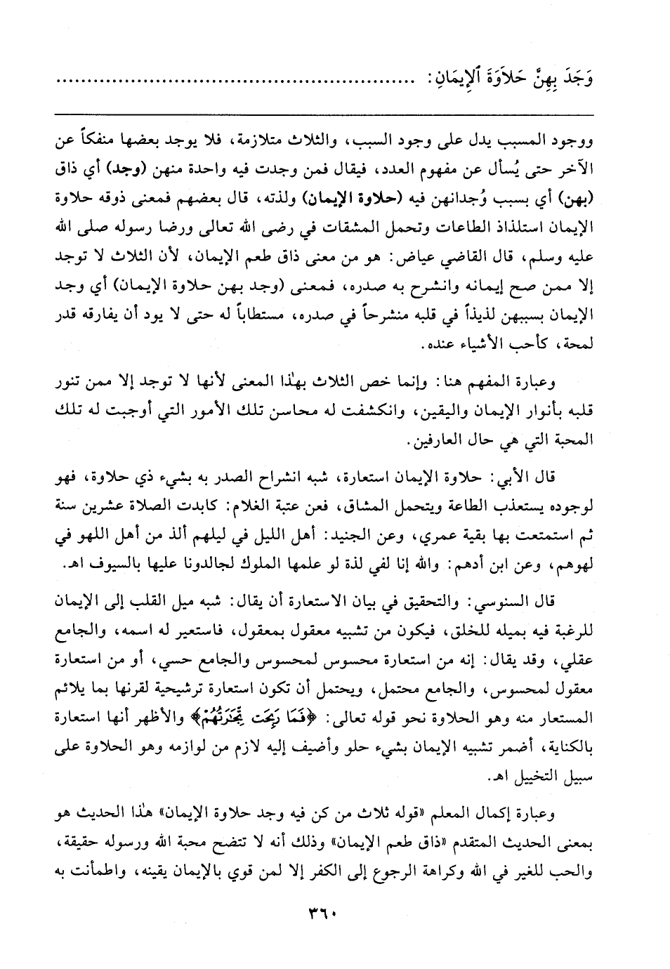 قال الأبي: حلاوة الإيمان استعارة، شبه انشراح الصدر به بشيء ذي حلاوة، فهو لوجوده يستعذب الطاعة ويتحمل المشاق، فعن عتبة الغلام: كابدت الصلاة عشرين سنة ثم استمتعت بها بقية عمري، وعن الجنيد: أهل الليل في ليلهم ألذ من أهل اللهوفي لهوهم، وعن ابن أدهم: والله إنا لفي لذة لو علمها الملوك لجالدونا عليها بالسيوف اهـ.