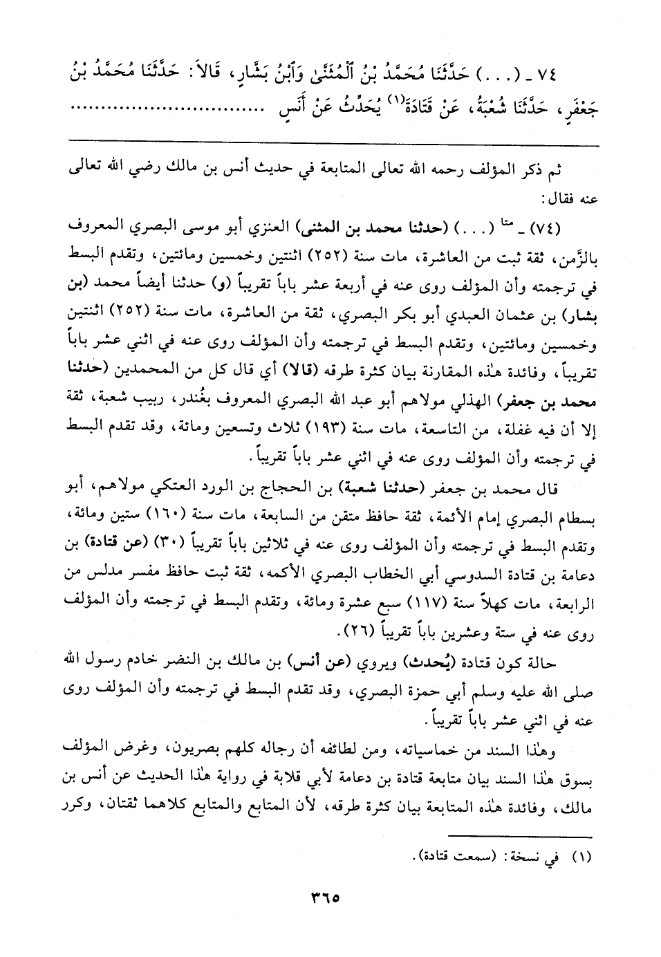 ٧٤ - (٠٠) حَدَّثَنَا مُحَمَّدُ بْنُ الْمُثَنَّى وَابْنُ بَشَّارٍ، قَالا: حَدَّثَنَا مُحَمَّدُ بْنُ جَعْفَرٍ، حَدَّثَنَا شُعْبَةُ، عَنْ قَتَادَةَ (١) يُحَدِّثُ عَنْ أَنَسٍ